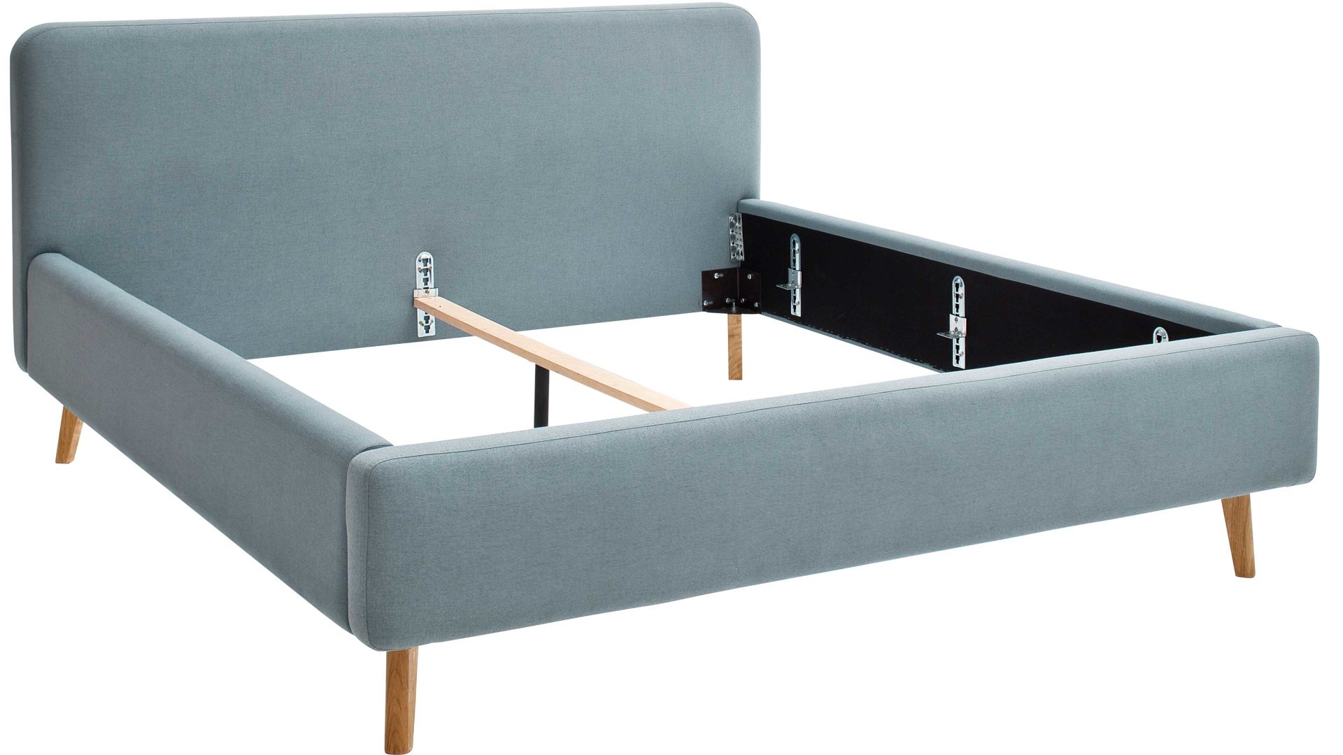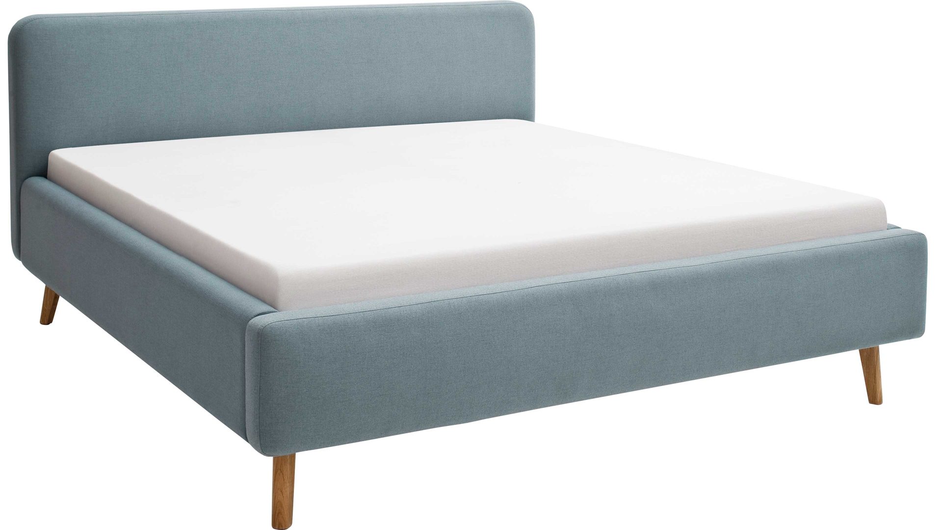 Mit den eichefarbenen Holzfüßen und dem eisblauen Flachgewebebezug bringt das Polsterbettgestell Mattis maritimes Flair in Ihr Schlafzimmer.