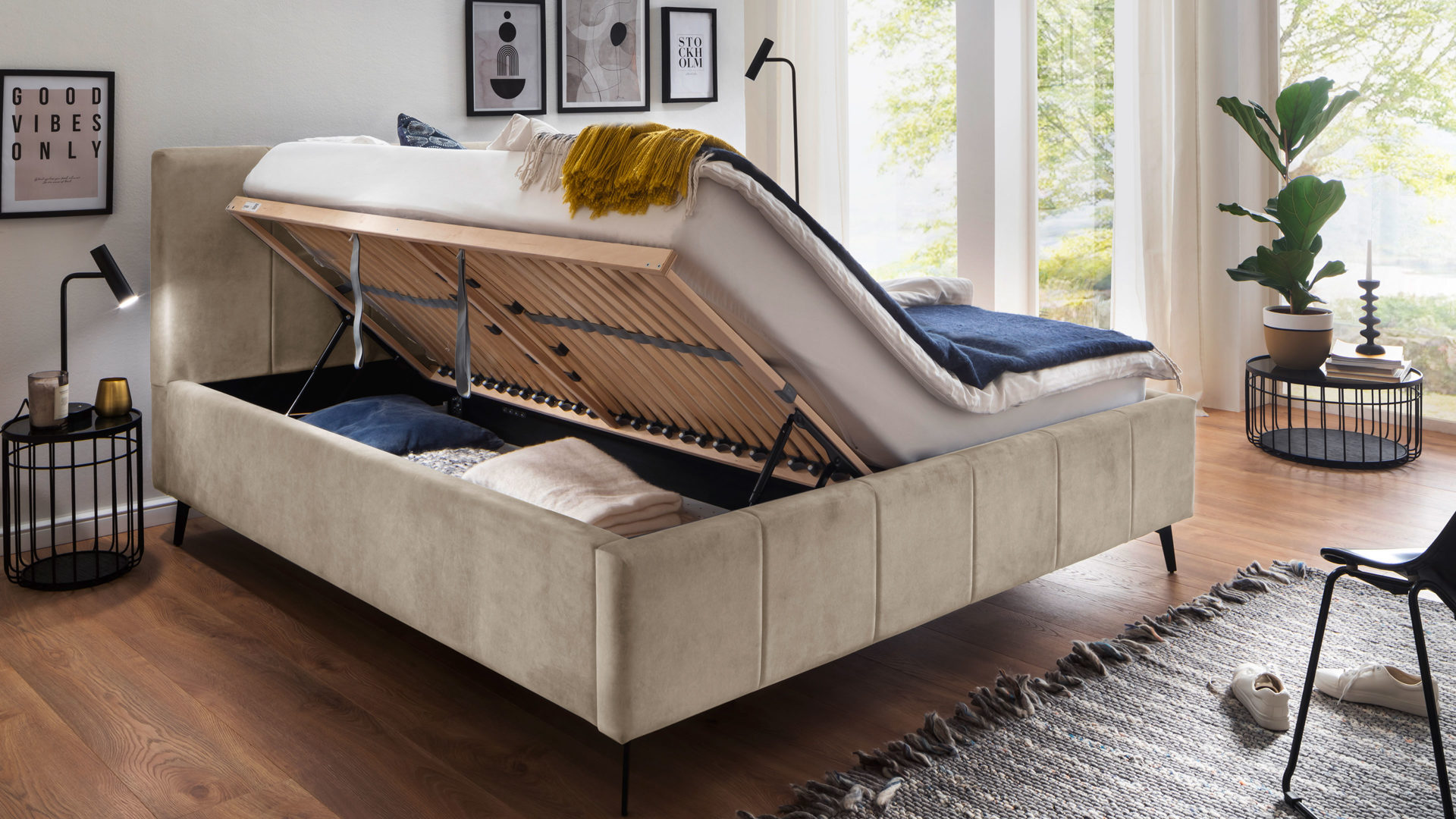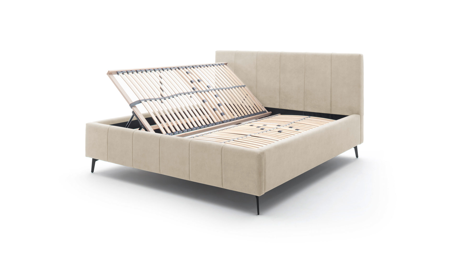 Unter einem seitlich zu öffnenden Federholzrahmen liegt ein geteilter und belüfteter Bettkasten. Der Lattenrost bringt 28 starre Leisten mit. Dank individueller Härtegradverstellung liegen Sie immer genau richtig: etwas weicher oder nach Belieben etwas fester gestützt.