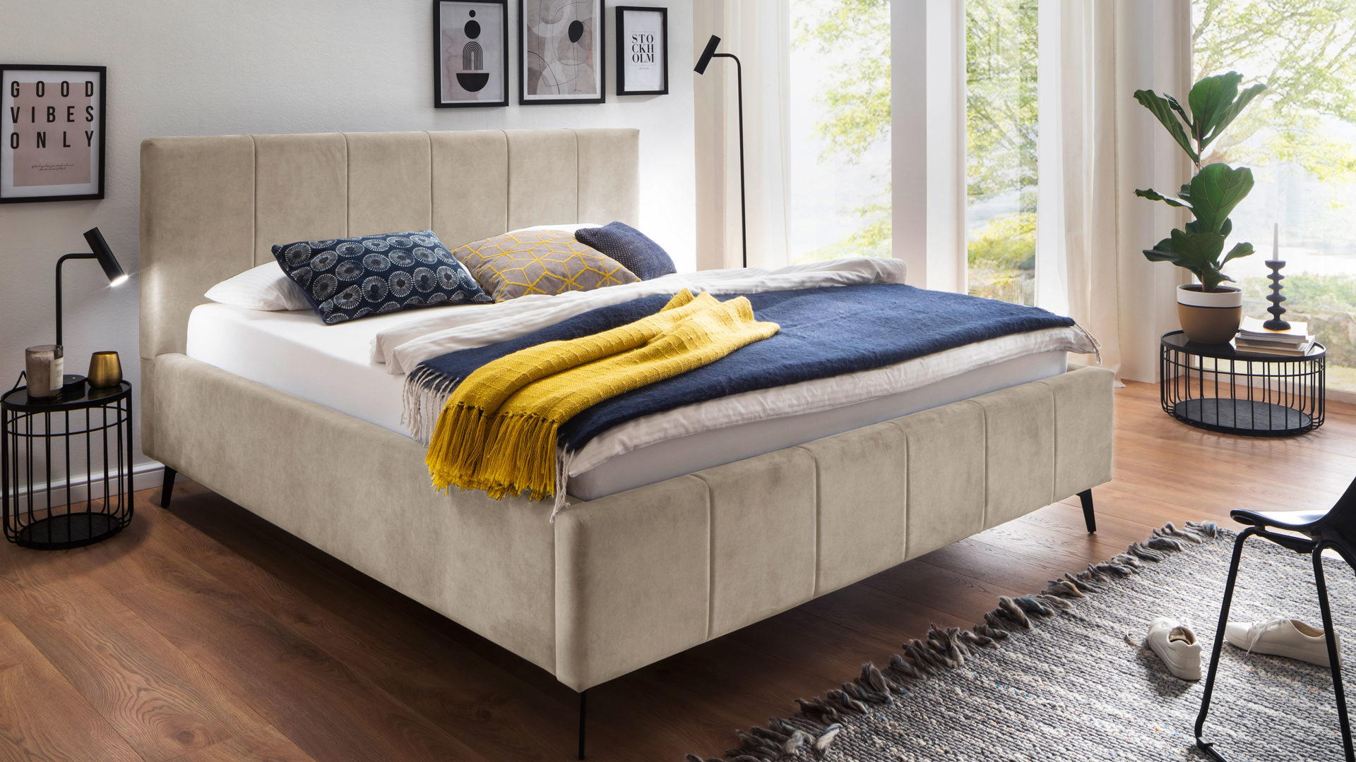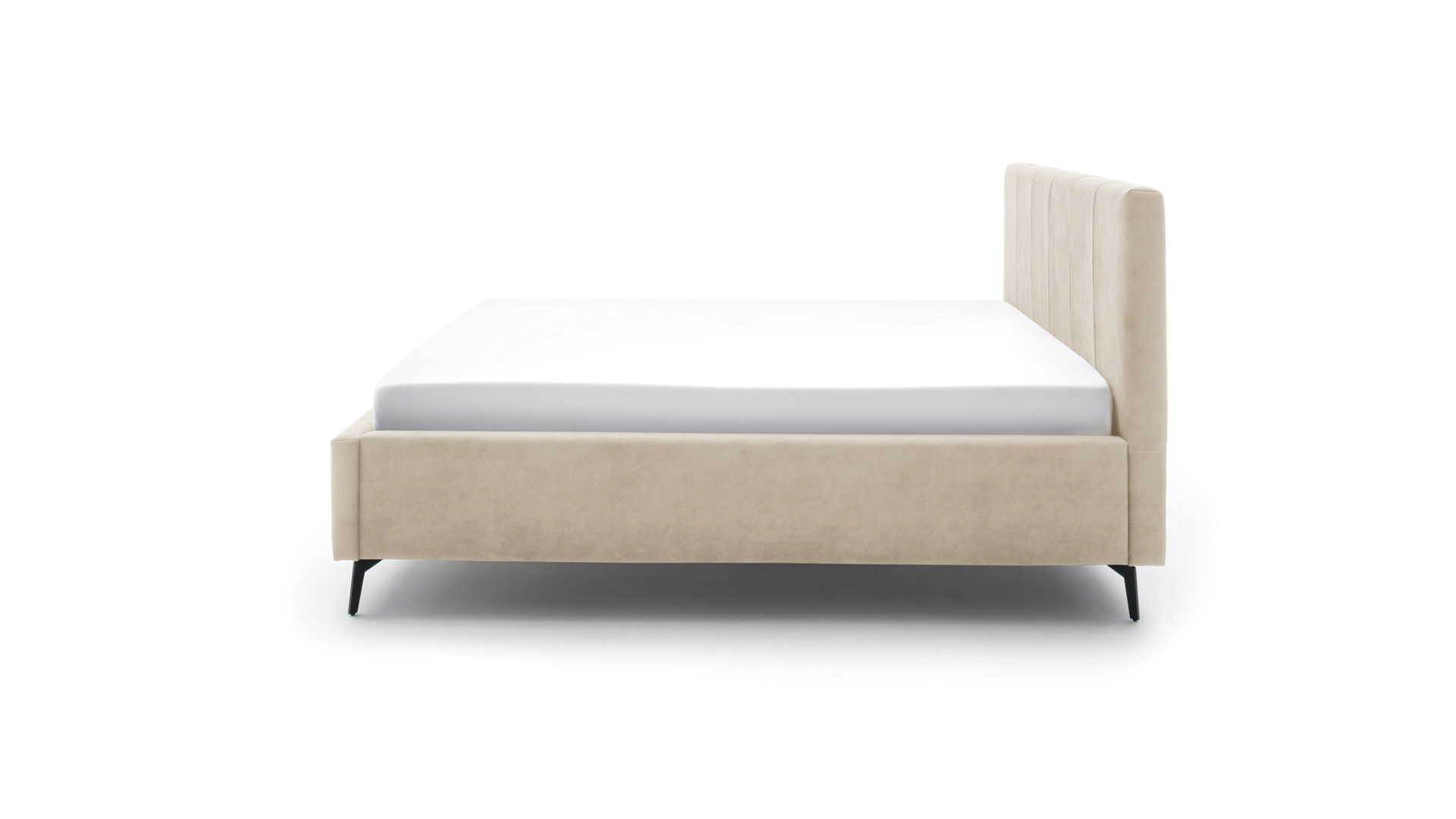 Das Polsterbettgestell Lizzano kommt im zeitlos schicken Design. Von den filigranen, schwarz lackierten Metallfüßen bis hin zum beigen Samtbezug Cloud 03 strahlt das Bett eine dezente Eleganz aus. Damit passt es in nahezu jedes Interieur: Mit einer romantisch angehauchten Schlafzimmereinrichtung harmoniert es ebenso wie mit geradlinigem Minimalismus.