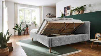 Im Lieferumfang des Bettgestells sind zwei hochwertige Lattenrahmen enthalten, die jeweils 28 Federholzleisten mit Härtegradverstellung aufweisen. Klappen Sie die Lattenrahmen seitlich hoch, um sich Zugang zu den Bettkästen mit Gasdruckdämpfer zu verschaffen. In den geräumigen Kästen können Sie etwa Bettzubehör wie Kissen und Decken sowie viele sonstige Utensilien praktisch platzsparend aufbewahren.
