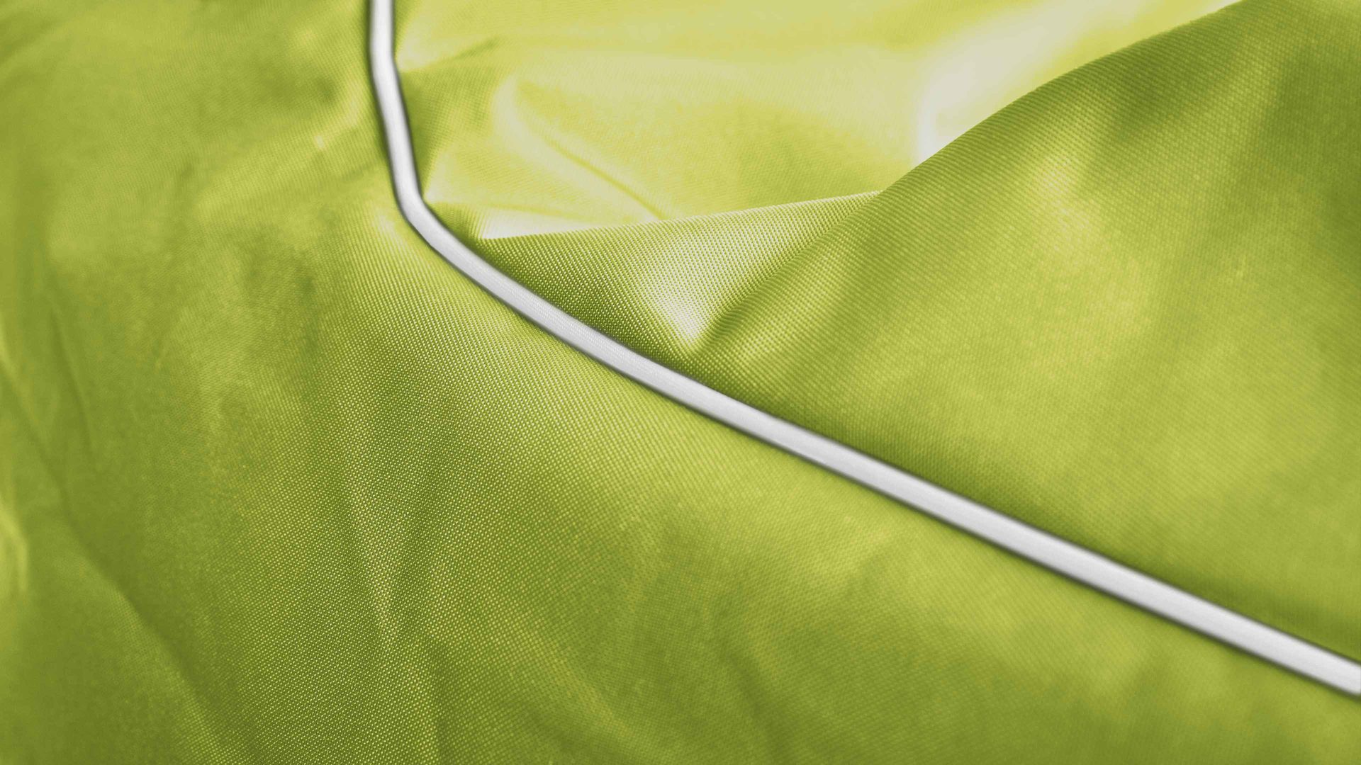 Durch seine dicht gewebte Struktur ist der Stoff besonders widerstandsfähig, unempfindlich gegenüber Nässe und leicht zu reinigen. Eine zusätzlich aufgebrachte PVC-Beschichtung auf der Innenseite des Stoffes macht scuba® zudem extrem robust und reißfest. Zugleich ist er angenehm weich und bequem. Der schwer entflammbare Bezug macht den Sessel zum perfekten Begleiter für Garten, Terrasse und Balkon. Ist die Füllung entfernt, lässt sich der Bezug bei 40 Grad im Schonwaschgang waschen.
