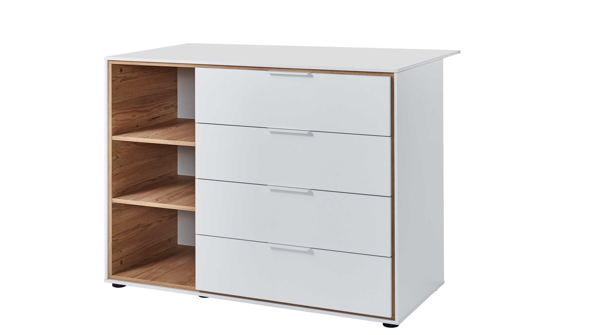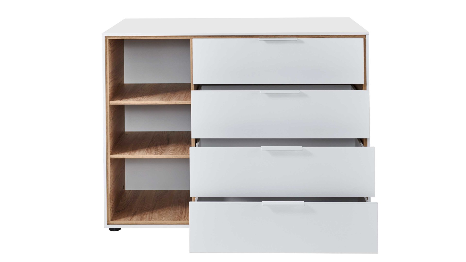 Die Kommode ist mit drei offenen eichefarbenen Fächern sowie vier geräumigen Schubkästen ausgestattet. Der obere Schubkasten verfügt zudem über einen Vollauszug, der ein bequemes Herausziehen ermöglicht. Bei Bedarf kann die Kombikommode auch mit einem Wickelaufsatz erweitert werden, der einfach aufgesetzt werden kann.