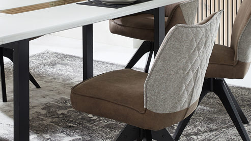 brauner Stoffbezug im Antikleder-Look, kombiniert mit beige-braun meliertem Stoffbezug mit Rautensteppung und mattschwarzem Metall