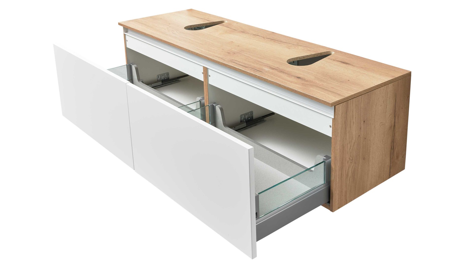 Ein holzfarbener Abdeckboden (Typ 16849) mit zwei präzisen Ausschnitten für die Waschbecken ist bereits enthalten. Maße: ca. 160 x 1,6 x 49 cm (B/LxHxT). So entsteht ein durchgängiges, modernes Gesamtbild.
