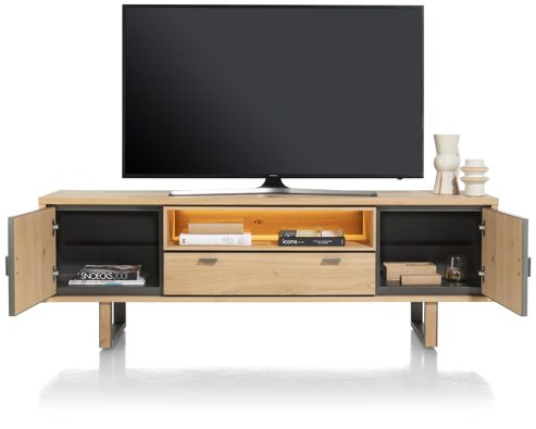 Ein weiteres Highlight sind die Metallprofile, die Schubladen und Türen umrahmen. In der Farbe Anthrazit gehalten, bilden sie einen stilvollen Kontrast zum warmen Holz und verleihen dem Lowboard einen modernen, industriellen Touch. Diese Metallelemente unterstreichen das hochwertige Design und ergänzen die robuste Bauweise.