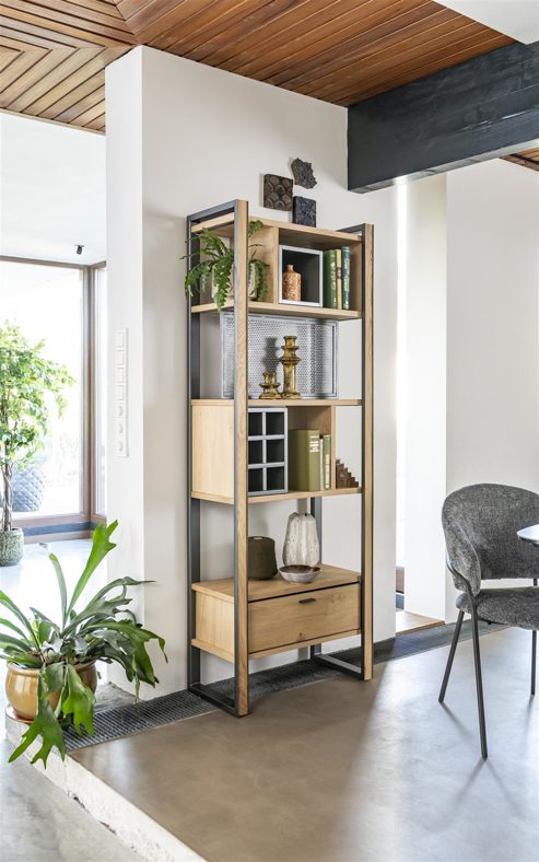 Ein markantes Designelement ist das Metallprofil, das Schubladen und Türen umrahmt. In edlem Anthrazit gehalten, bildet es einen stilvollen Kontrast zum natürlichen Holzton und verleiht dem Regal eine moderne, industrielle Note. Diese Kombination aus natürlichen Materialien und industriellen Akzenten macht das Regal Shimanto Nr. 51614 zu einem vielseitigen Möbelstück, das sich nahtlos in verschiedenste Einrichtungsstile einfügt, von klassisch bis hin zu modern.