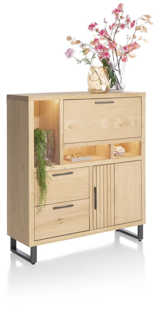 Mit seinem zeitlosen Design und der natürlichen Farbgebung fügt sich das Highboard harmonisch in verschiedenste Einrichtungsstile ein, während es gleichzeitig eine warme und einladende Atmosphäre schafft. Die Kombination aus Eichenfurnier und massivem Eichenholz verleiht dem Highboard eine robuste Struktur und eine ansprechende Optik, die jeden Raum aufwertet.