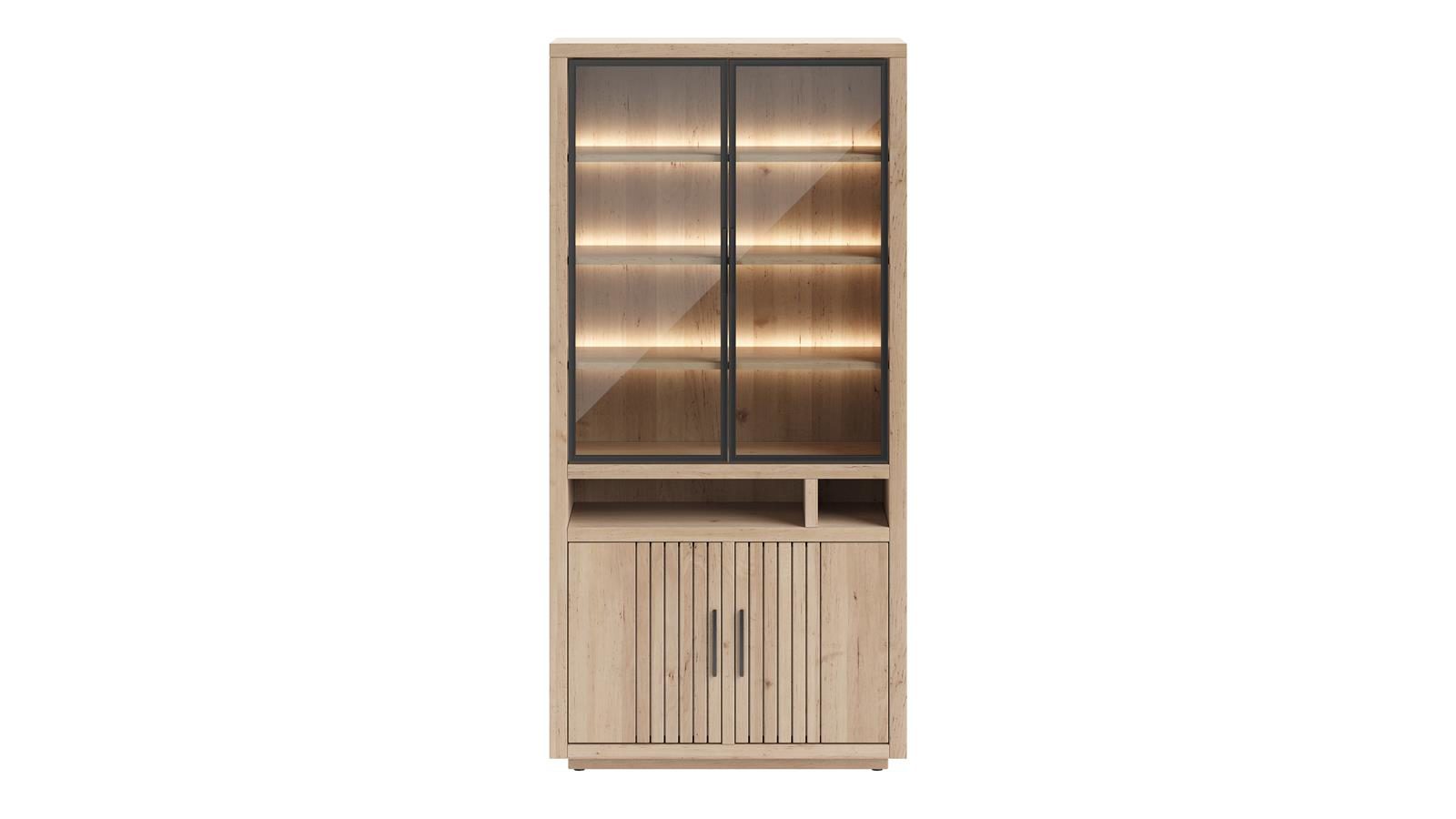 Die natürliche Farbgebung des Eichenholzes verleiht diesem Möbelstück eine warme und einladende Ausstrahlung, die jede Umgebung bereichert. Zusätzlich ist der Vitrine mit einer LED-Beleuchtung ausgestattet, die für eine angenehme Atmosphäre sorgt und Ihre Lieblingsstücke stilvoll in Szene setzt.