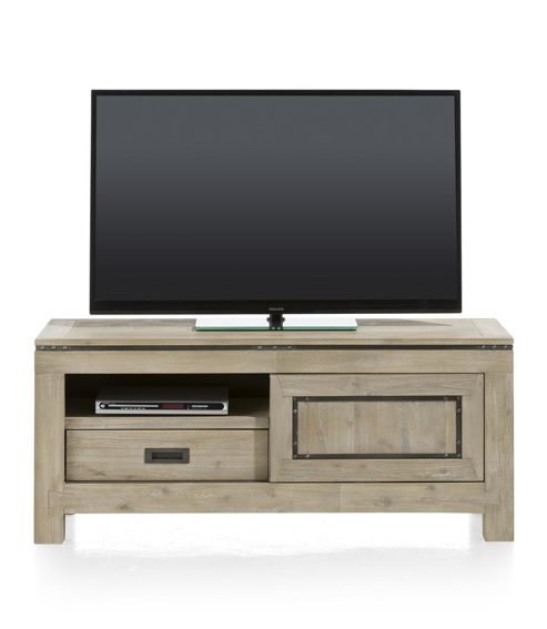 So kommt das TV-Sideboard in teil massivem Akakzien Holz, welches vor allem den rustikalen Charme des Ganzen unterstreicht. Auch die dunkel gehaltenen Griffe und Applikationen tragen dazu bei.