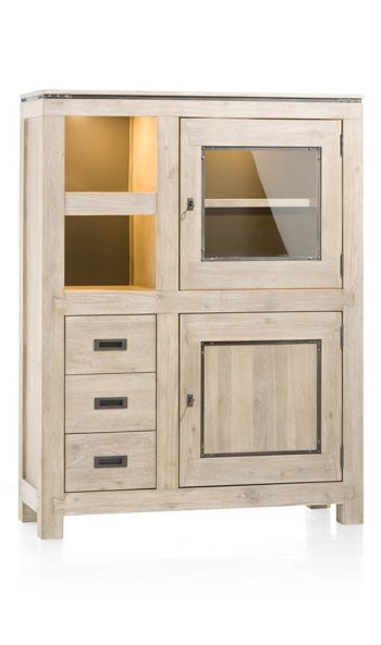 Darüber hinaus punktet der Schrank deutlich in Sachen Stauraum. Hierfür sorgen 2 Nischen, 3 Schubladen und 2 Türen, wovon eine der beiden über eine integrierte Glasscheibe verfügt. Dies macht den Schrank zu einem wahren Raumwunder