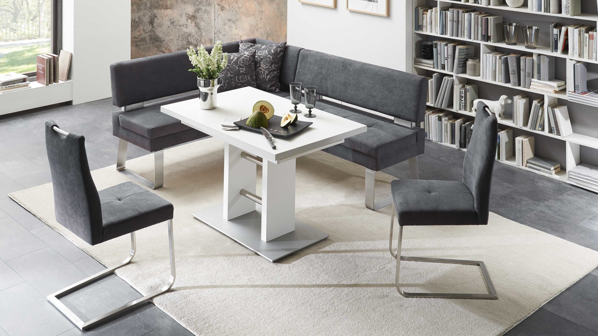 Als stabilisierende Basis fungiert eine klassisch-edelstahlfarbene Bodenplatte. Auch die Querstreben des Gestells sind im Edelstahlton gehalten. Durch die strahlend weißen Kunststoffoberflächen, die sowohl das Gestell als auch die Tischplatte zieren, erscheint der Esszimmertisch besonders leuchtend und einladend.