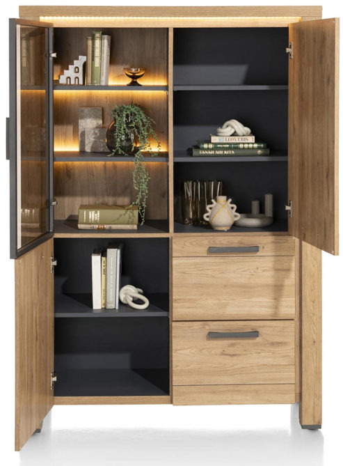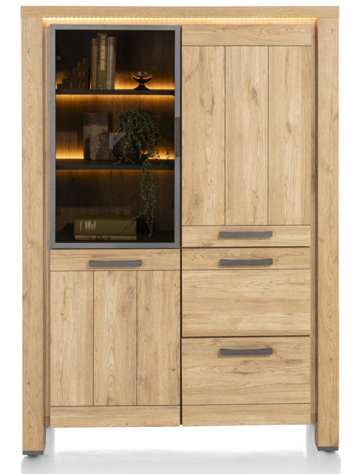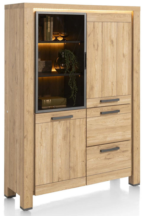 Obwohl der Delmonte wie ein Massivholzschrank aussieht, besteht er aus hochwertigem Primo Laminato (HPL), das kratzfest, leicht und pflegeleicht ist. Der durchdachte Vitrinenbereich mit eleganter Glastür und integrierter LED-Beleuchtung präsentiert Dekorationsobjekte geschmackvoll. Zusätzlich bietet der Schrank zwei Türen und zwei Schubladen für ausreichend Stauraum.