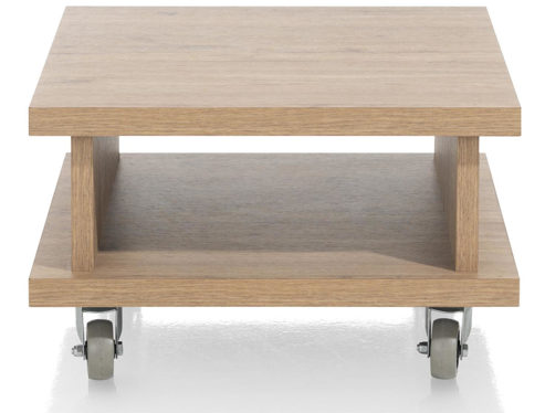 Dank der praktischen Rollen ist der Delmonte mobil und flexibel einsetzbar – ideal als Beistelltisch neben dem Sofa oder als freistehendes Element. Unter der stilvollen Tischplatte befindet sich ein offenes Fach, das zusätzlichen Stauraum bietet. Die Konstruktion aus Primo Laminato (HPL) in der Farbe Eiche Natur ist leicht, robust und pflegeleicht. Dieses Material sieht aus wie Holz, ist jedoch kratzfest und perfekt für den täglichen Gebrauch.