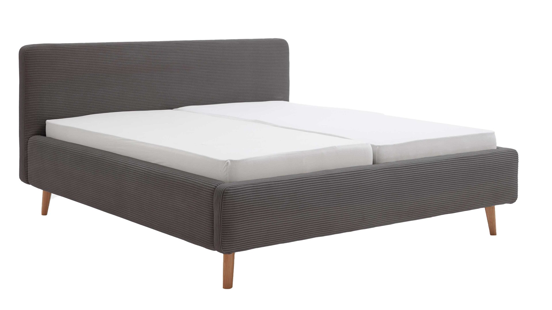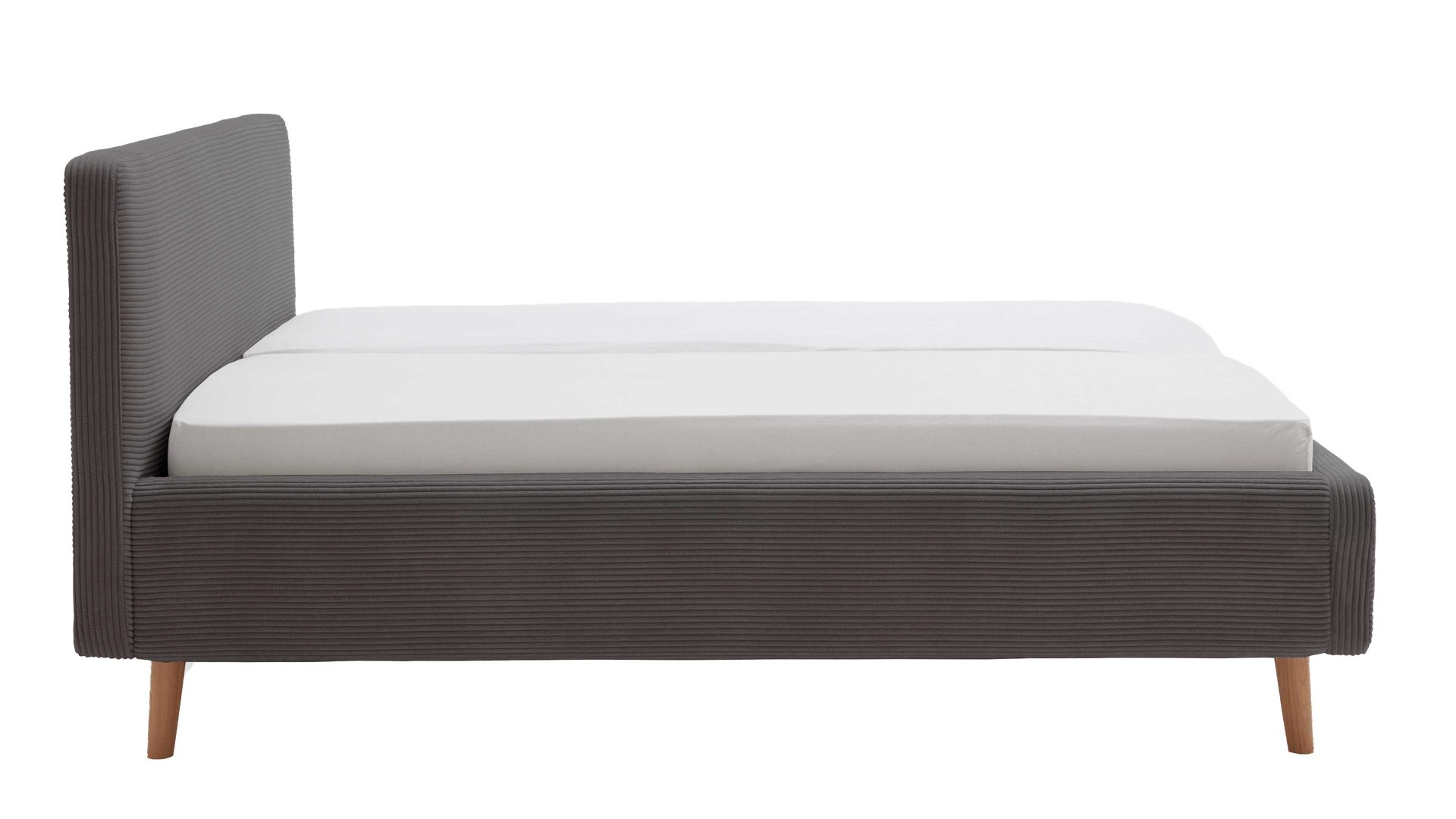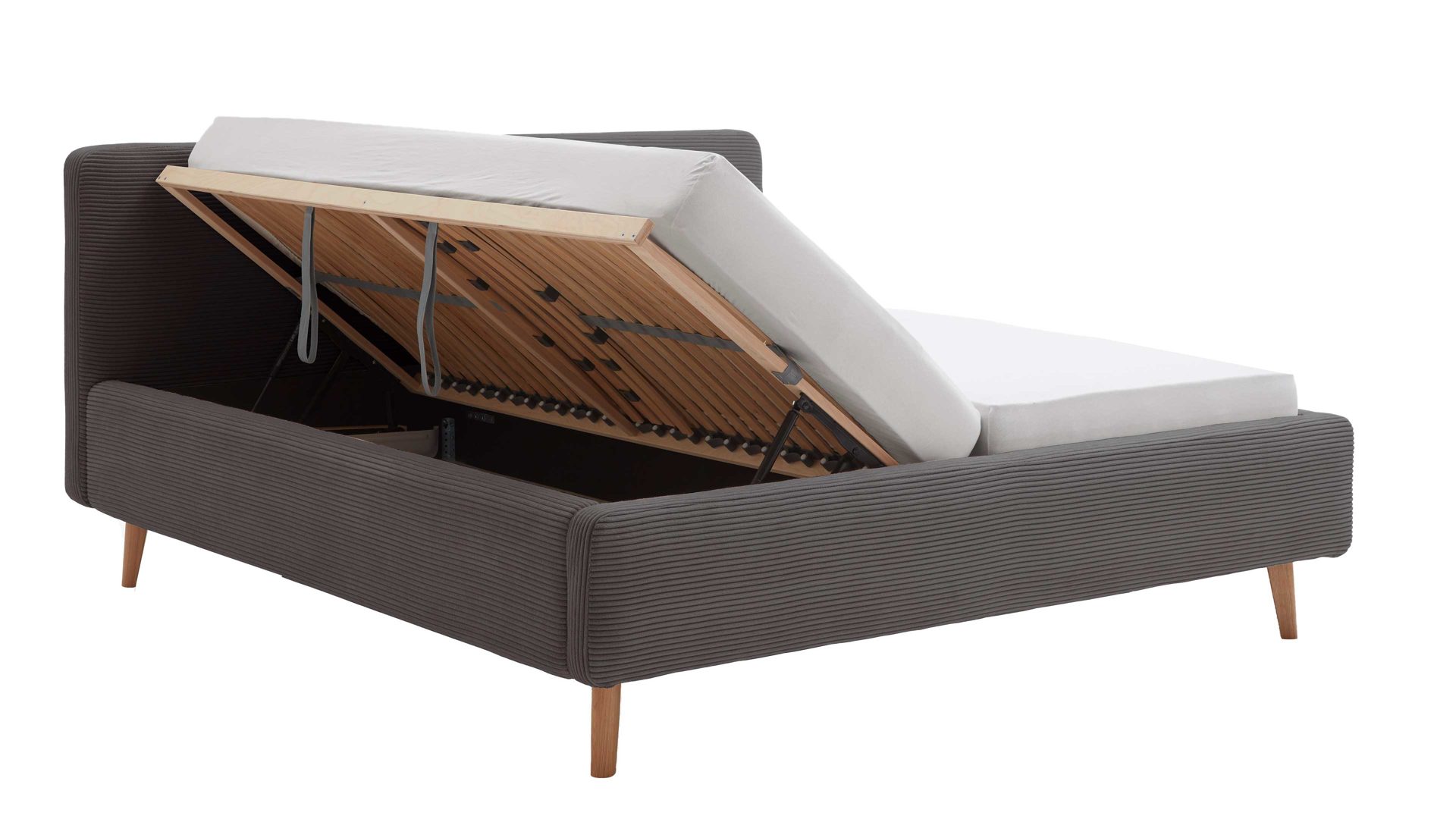 Das Polsterbettgestell Mattis mit Bettkasten begeistert durch die elegante Trendoptik sowie die exzellente Material- und Verarbeitungsqualität. Es kombiniert eichefarbene Holzfüße mit einem grauen Breitcordbezug. Sowohl die Bettseiten als auch das Polsterkopfteil sind glatt bezogen. Letzteres lädt Sie ein, sich anzulehnen, wenn Sie abends im Bett vor dem Schlafen noch fernsehen oder in einem Buch lesen.