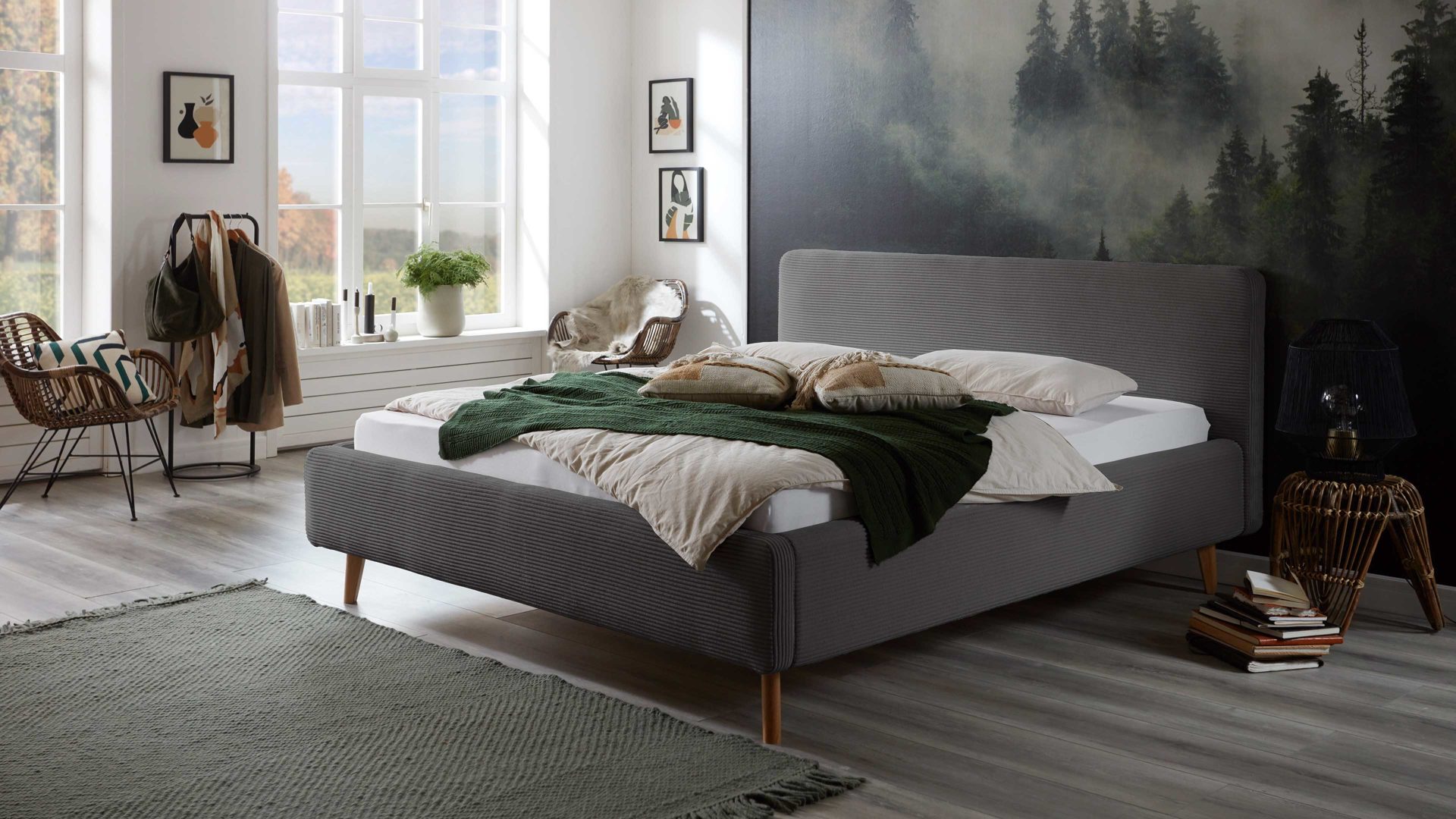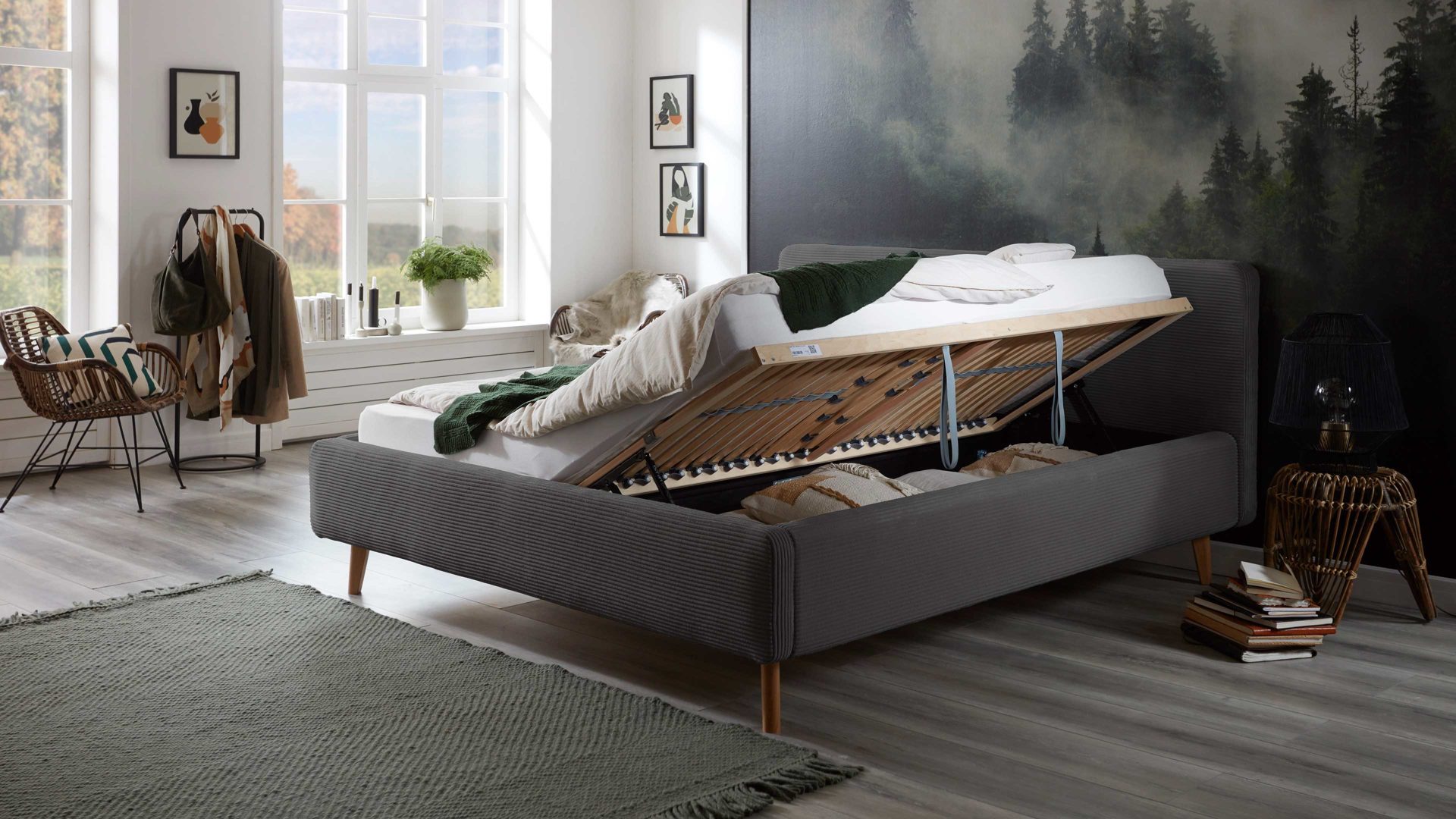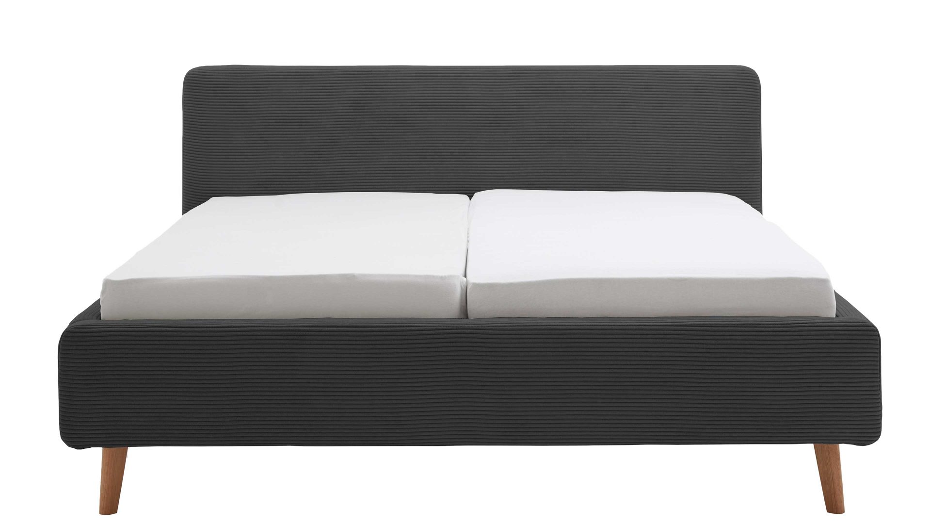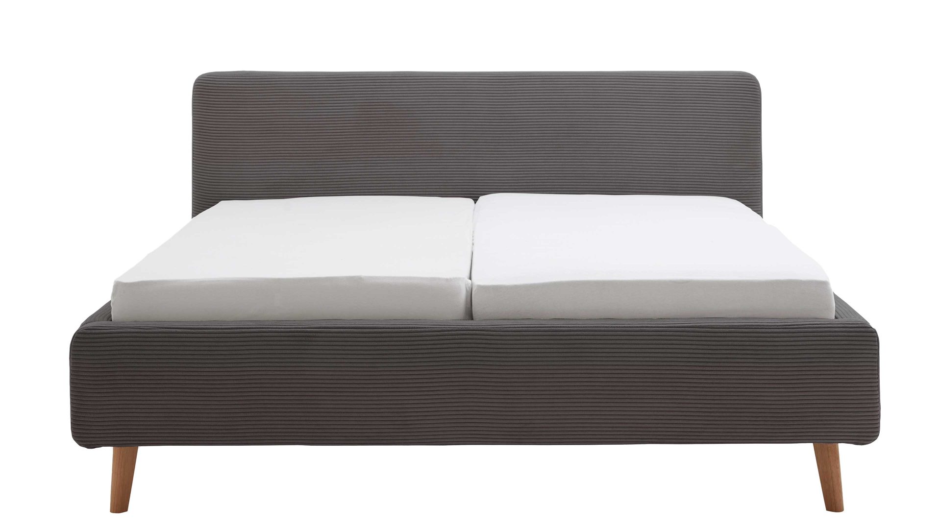 Das Polsterbettgestell Mattis mit Bettkasten begeistert durch die elegante Trendoptik sowie die exzellente Material- und Verarbeitungsqualität. Es kombiniert eichefarbene Holzfüße mit einem grauen Breitcordbezug. Sowohl die Bettseiten als auch das Polsterkopfteil sind glatt bezogen. Letzteres lädt Sie ein, sich anzulehnen, wenn Sie abends im Bett vor dem Schlafen noch fernsehen oder in einem Buch lesen.