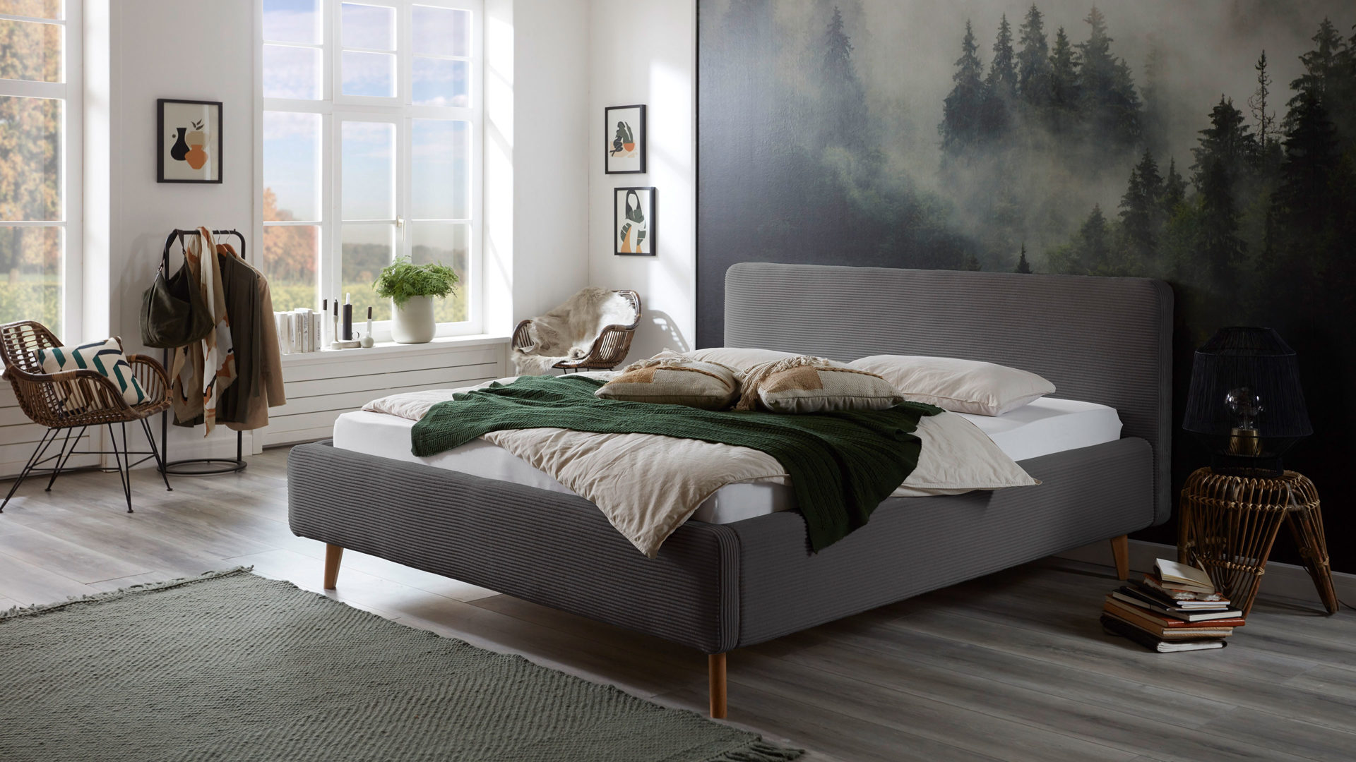 Das Polsterbettgestell Mattis begeistert durch die elegante Optik sowie die hervorragende Material- und Verarbeitungsqualität. Es kombiniert einen grauen Breitcord-Bezug mit eichefarbenen Holzfüßen. Sowohl die Bettseiten als auch das Polsterkopfteil sind glatt bezogen. Letzteres lädt Sie ein, sich anzulehnen, wenn Sie abends im Bett vor dem Schlafen noch fernsehen oder in einem Buch lesen.