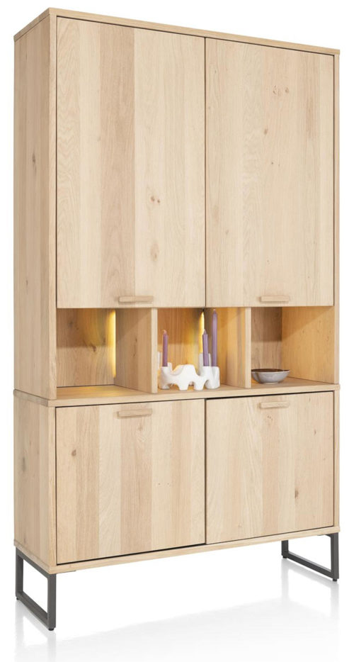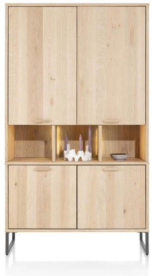 Seine Holzgriffe fügen sich harmonisch ins Gesamtbild ein, während die stabilen Metallbeine einen modernen Akzent setzen. In verschiedenen Ausführungen erhältlich, passt er sich flexibel an unterschiedliche Wohnräume an. Besonders elegant: Zwei nebeneinander gestellt, entsteht eine große Schrankwand mit viel Stauraum. Zusätzlich sorgt die integrierte LED-Beleuchtung für eine stilvolle Inszenierung und setzt den Schrank gekonnt in Szene.