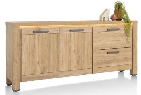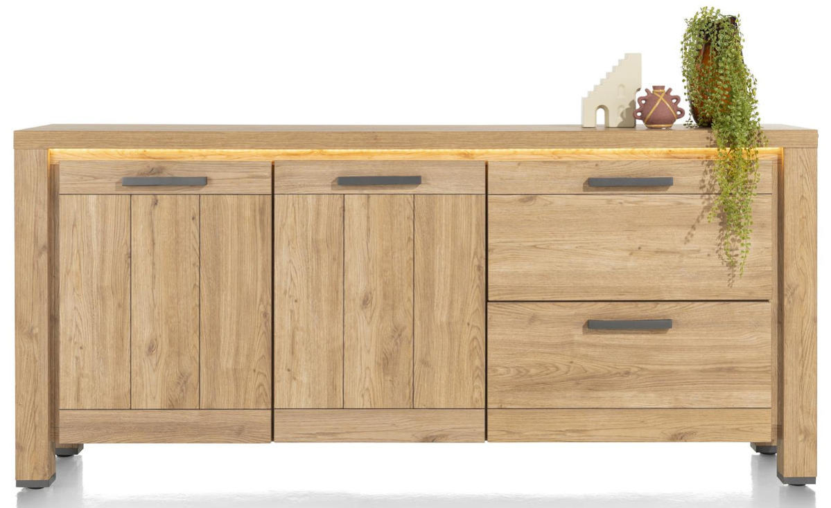 Das Sideboard Delmonte von Henders & Hazel kombiniert klassisches und rustikales Design mit modernen Akzenten. Es bietet mit seinen ansprechenden Paneelen und Metall-Details nicht nur einen ästhetischen Genuss, sondern auch viel Stauraum für den Wohnbereich. Hergestellt aus pflegeleichtem Primo Laminato in Eiche Natur, bietet es das Aussehen von echtem Holz, ist aber deutlich widerstandsfähiger gegen Kratzer. Das Sideboard ist in Breiten von 190 cm und 230 cm erhältlich und variiert in der Anzahl der Türen und Schubladen. Ein besonderes Highlight ist die integrierte LED-Stimmungsbeleuchtung mit Touch-Einbaudimmer, die eine angenehme Atmosphäre schafft. Zudem sorgt das Soft-Close-System für ein leises und sanftes Schließen der Türen, was den Nutzungskomfort erhöht.