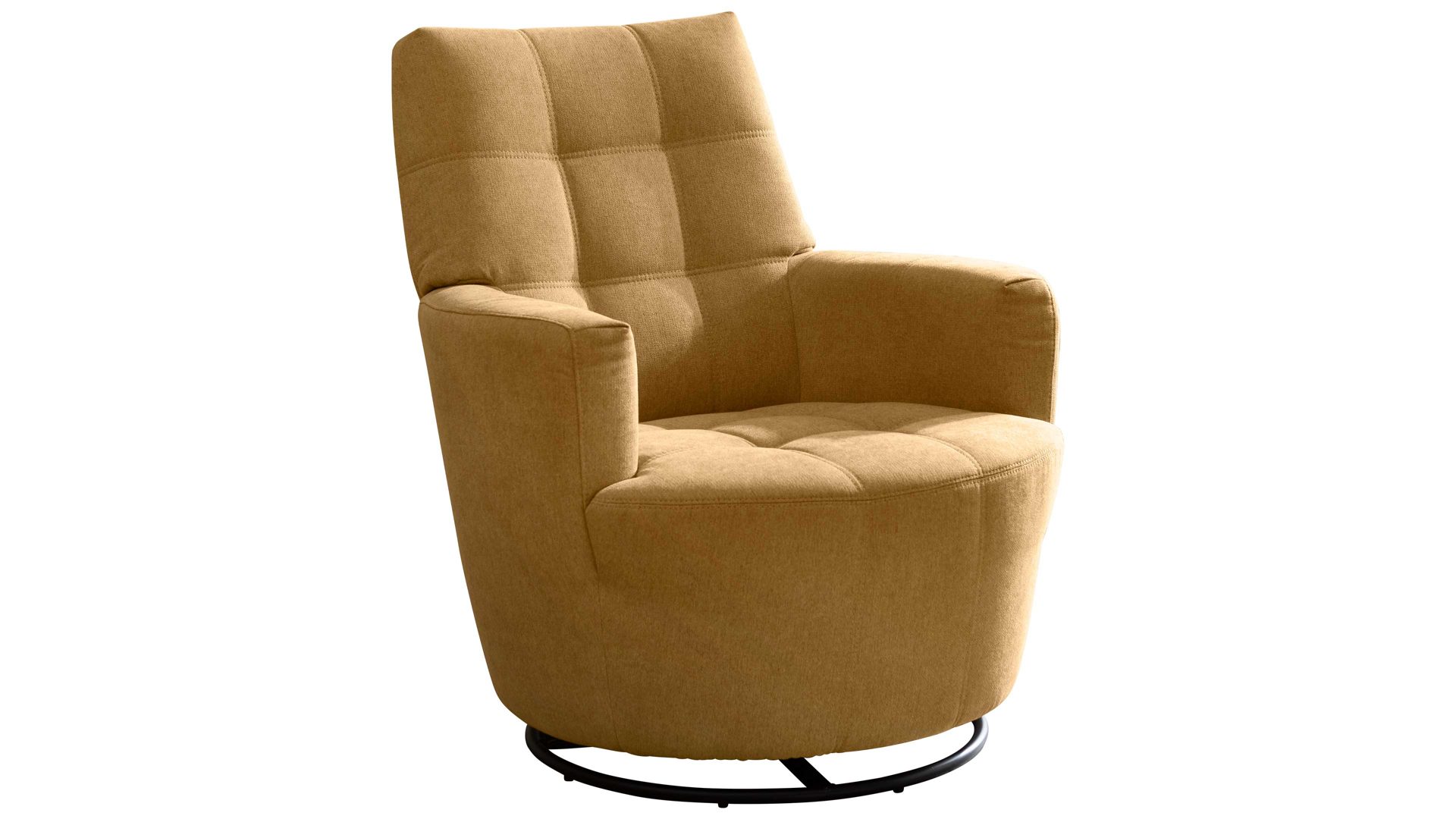 Dieser Relaxsessel kombiniert einen robusten mattschwarzen Metall-Sternfuß mit einem stilvollen senffarbenen Lederbezug.
