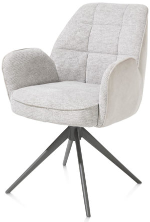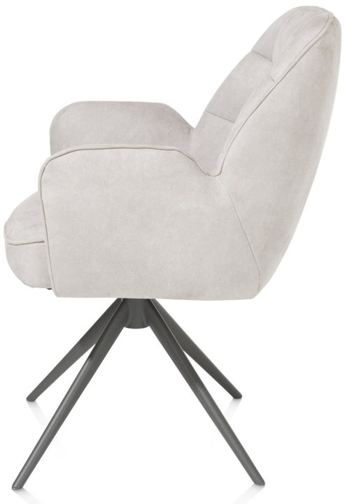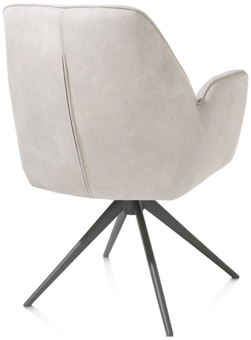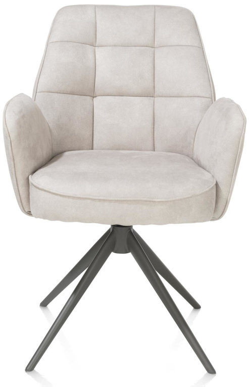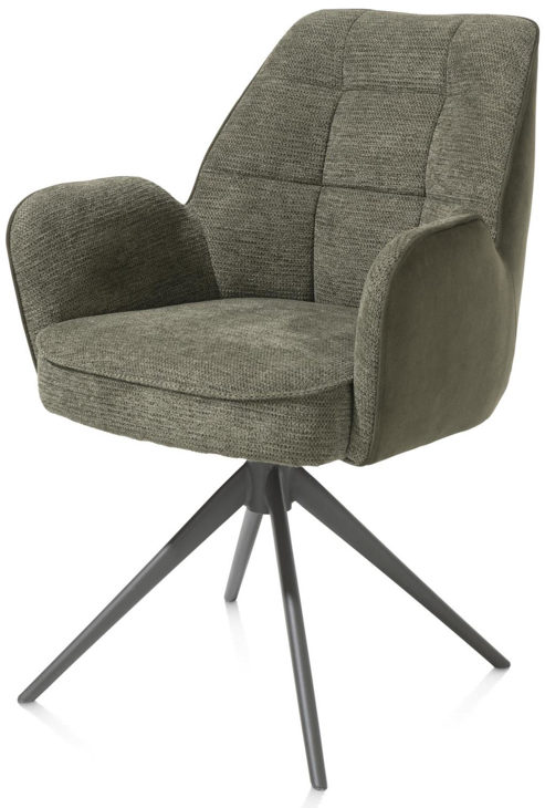Der Armlehnenstuhl Bell von Henders & Hazel vereint stilvolle Optik und hohen Sitzkomfort dank seines Taschenfederkerns. Die rautenförmigen Ziernähte verleihen ihm eine elegante Note, während das drehbare, graphitfarbene Gestell für Flexibilität sorgt. Vollständig mit dem hochwertigen Mikrofaserstoff Calabria bezogen, garantiert der Esszimmerstuhl eine angenehme Haptik. In den Farben Kiesel, Moosgrün und Olive erhältlich ist er eine stilvolle Bereicherung für jedes Wohn- oder Esszimmer.