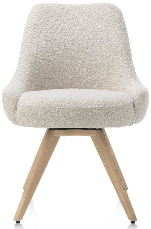 Der Stuhl Rocco von Henders & Hazel kombiniert modernes Design mit hohem Komfort. Ausgestattet mit einem Taschenfederkern und einem drehbaren Sitz bietet er optimalen Sitzkomfort. Der weiche Bouclé-Stoff ist in den eleganten Farben Creme sowie Leber erhältlich. Die breite Rückenlehne sorgt für zusätzlichen Halt, während die vier stabilen Metallbeine in Graphit dem Stuhl eine moderne Note verleihen. Alternativ sind auch Holzfüße verfügbar. Der Rocco ist zudem als Armlehnenstuhl erhältlich und eignet sich ideal für verschiedene Räume – vom Esszimmer bis zum Wohnzimmer.