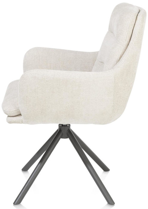 Der Armlehnenstuhl Mia von Henders & Hazel vereint stilvolles Design mit hohem Komfort. Die eleganten Ziernähte und der weiche Bezug aus Livigno-Chenille, einem 100% Polyester-Stoff, sorgen für eine besonders angenehme Haptik. Durch die extra gepolsterte Rückenlehne und die bequemen Armlehnen bietet der Stuhl optimalen Sitzkomfort. Erhältlich in den Farben Braun, Creme, Dunkelgrün und Ockergelb, passt er sich verschiedenen Einrichtungsstilen an. Das drehbare Metallgestell in Graphitfarbe verleiht dem Armlehnenstuhl eine moderne, edle Optik und macht ihn zu einem perfekten Begleiter für den Essbereich.