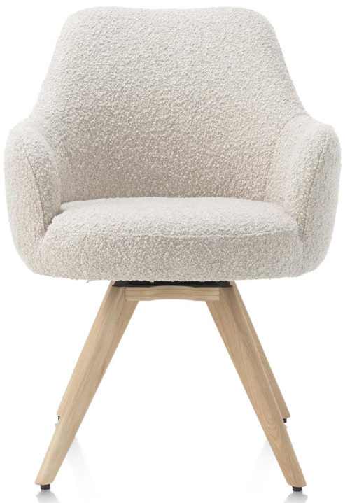 Der Stuhl Rocco von Henders & Hazel kombiniert modernes Design mit hohem Komfort. Ausgestattet mit einem Taschenfederkern und einem drehbaren Sitz bietet er optimalen Sitzkomfort. Der weiche Bouclé-Stoff ist in den eleganten Farben Creme sowie Leber erhältlich. Die breite Rückenlehne sorgt für zusätzlichen Halt, während die vier stabilen Metallbeine in Graphit dem Stuhl eine moderne Note verleihen. Alternativ sind auch Holzfüße verfügbar. Der Rocco ist zudem als Armlehnenstuhl erhältlich und eignet sich ideal für verschiedene Räume – vom Esszimmer bis zum Wohnzimmer.