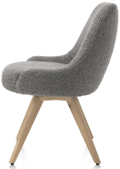 Der Stuhl Rocco von Henders & Hazel kombiniert modernes Design mit hohem Komfort. Ausgestattet mit einem Taschenfederkern und einem drehbaren Sitz bietet er optimalen Sitzkomfort. Der weiche Bouclé-Stoff ist in den eleganten Farben Creme sowie Leber erhältlich. Die breite Rückenlehne sorgt für zusätzlichen Halt, während die vier stabilen Metallbeine in Graphit dem Stuhl eine moderne Note verleihen. Alternativ sind auch Holzfüße verfügbar. Der Rocco ist zudem als Armlehnenstuhl erhältlich und eignet sich ideal für verschiedene Räume – vom Esszimmer bis zum Wohnzimmer.