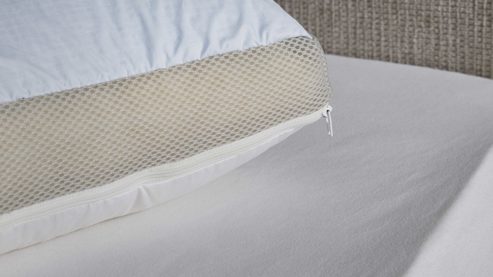 Der Bezug aus feinem, weißem Daunen-Batist fühlt sich angenehm weich auf der Haut an und ist bis 60 °C waschbar. Dank des dreiseitigen Reißverschlusses lässt er sich leicht abnehmen und pflegen. Das eingearbeitete 3D-Klimaband und der ca. 8 cm hohe Außensteg fördern die Luftzirkulation und verleihen dem Kissen zusätzliche Formstabilität. Selbstverständlich ist das Kissen nach OEKO-TEX® Standard 100 zertifiziert – für geprüfte Qualität und hautfreundliche Materialien.