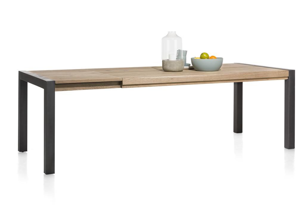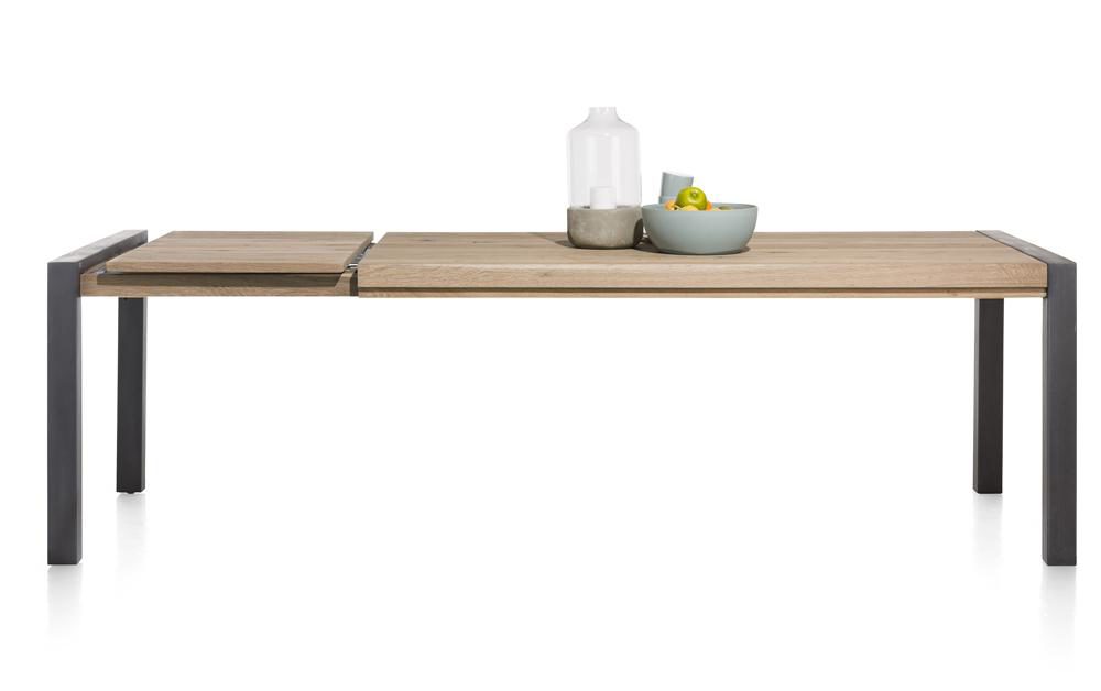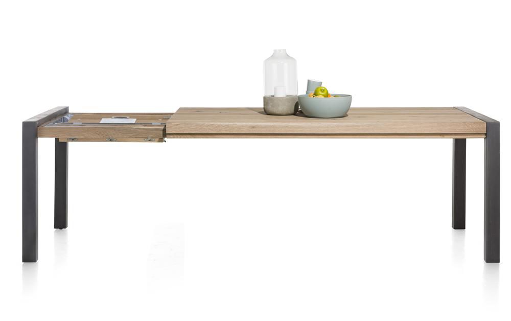 Der Tisch Brooklyn 37155RWB von Habufa können Sie bei Bedarf im Handumdrehen um ca. 60 cm erweitern. Dank seines Butterflyauszuges ist die Ansteckplatte im inneren des Tisches gelagert und benötigt keinen zusätzlichen Stauraum im Esszimmer. Die Tischplatte besteht aus massiven Eichenholz, welches weitgehend in seinem Urzustand belassen wurde. Astlöcher, Wachstumsrisse und Unebenheiten geben dem Tisch seinen unverwechselbaren Charakter und machen jedes Möbelstück der Habufa Brooklyn Reihe zu einem echten Unikat. Manche stellen sind mit einem schwarzem Spachtel versehen, der optimal mit dem Metallgestell harmoniert. Ausgezogen erhalten Sie eine Breite von ca. 250 cm, also genug Platz für einen schönen Abend mit Besuch.