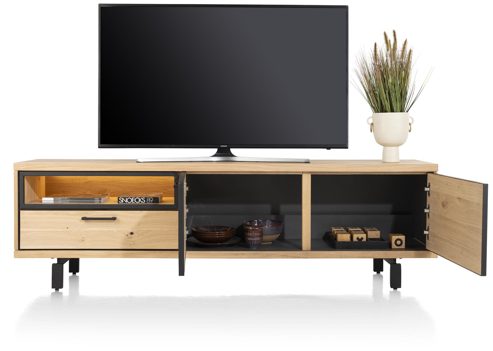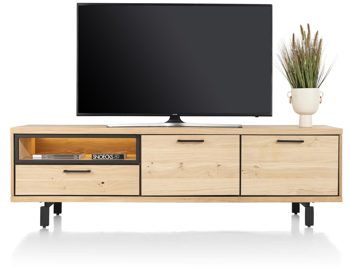 Ein besonderes Highlight ist die integrierte LED-Beleuchtung in der Nische des Lowboards. Diese nicht nur hebt die ausgestellten Gegenstände effektvoll hervor, sondern schafft auch eine angenehme Atmosphäre im Raum. Ob als Standort für Ihren Fernseher, zur Präsentation von Deko-Objekten oder als stilvolle Aufbewahrungslösung – das Ridgefield Lowboard ist eine Bereicherung für jedes Zuhause.