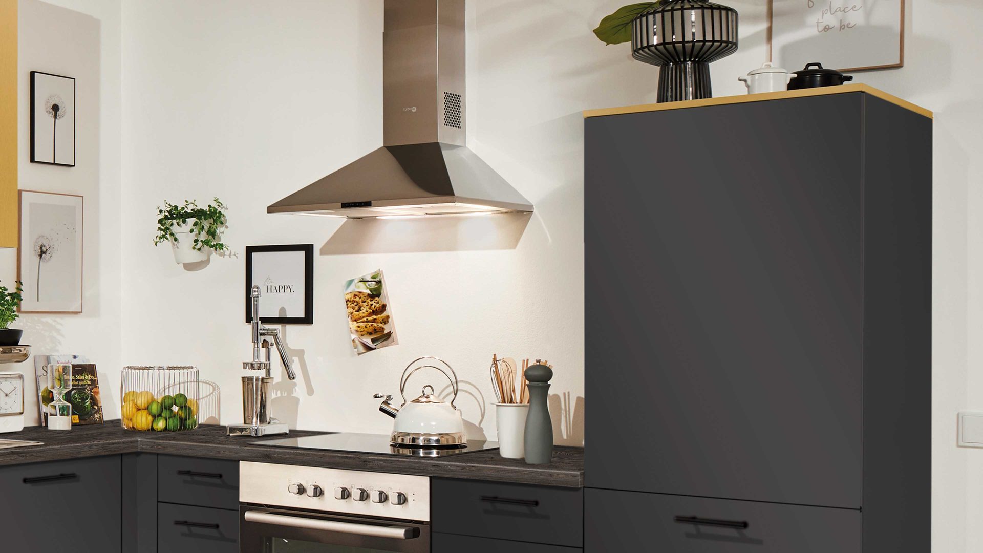 supermattes Grafit, kombiniert mit Alux Gold, schwarzen Metall-Bügelgriffen und Arbeitsplatten in Hemlock Lava