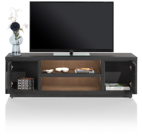 Das markante Design wird durch subtile Metallakzente akzentuiert, die dem Lowboard einen Hauch von Raffinesse verleihen. In der Farbvariante "Castle Black" präsentiert sich das Möbelstück in einem klassischen und dennoch zeitgemäßen Look, der sich nahtlos in verschiedenste Einrichtungsstile integrieren lässt.