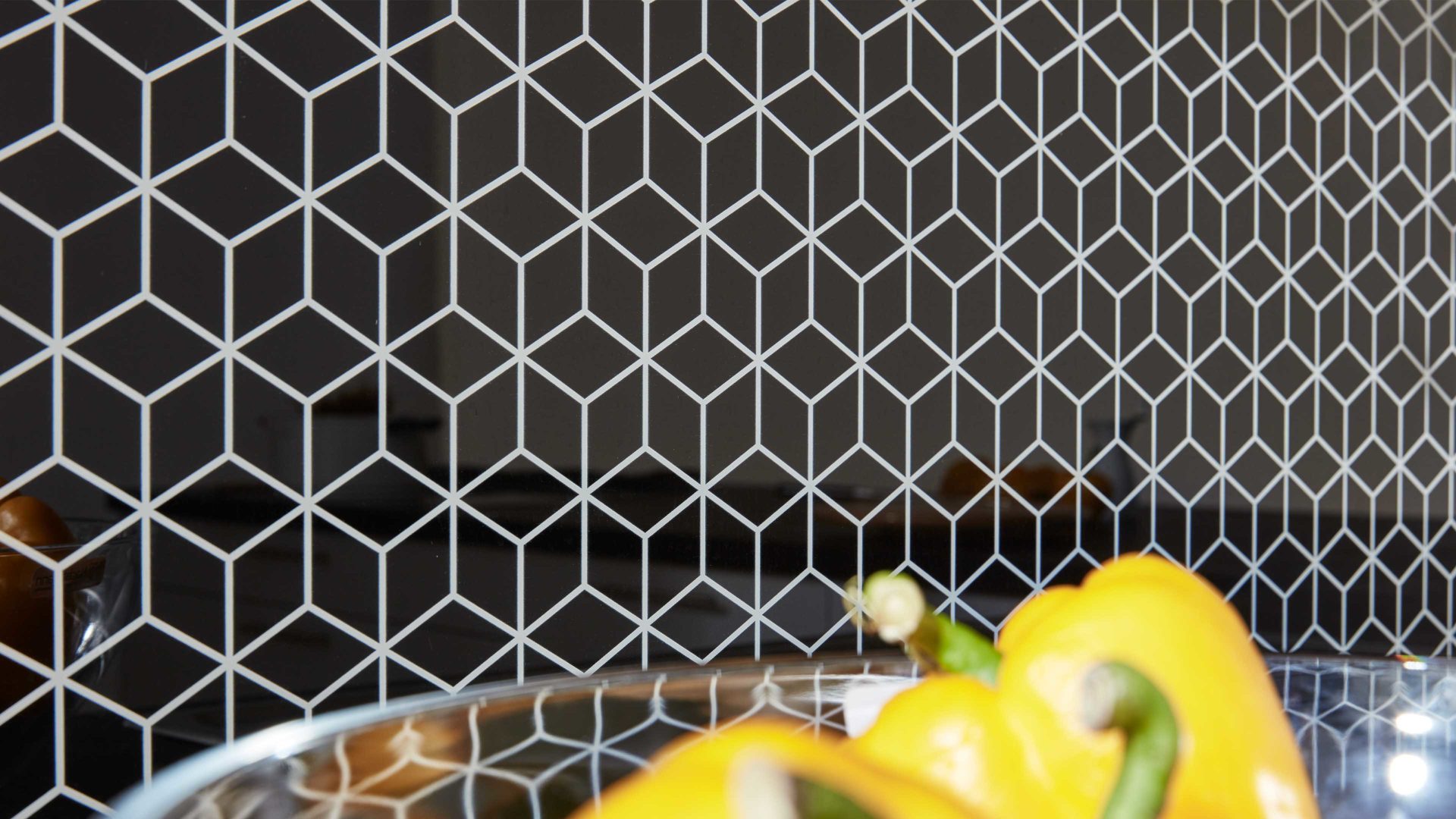 Ein optisches Highlight ist die schwarze Glas-Nischenverkleidung mit weißem Rhombus-Muster, die der Küche Tiefe und Individualität verleiht. Die Unterschränke bieten reichlich Stauraum und integrieren eine hochwertige Edelstahl-Einbauspüle.