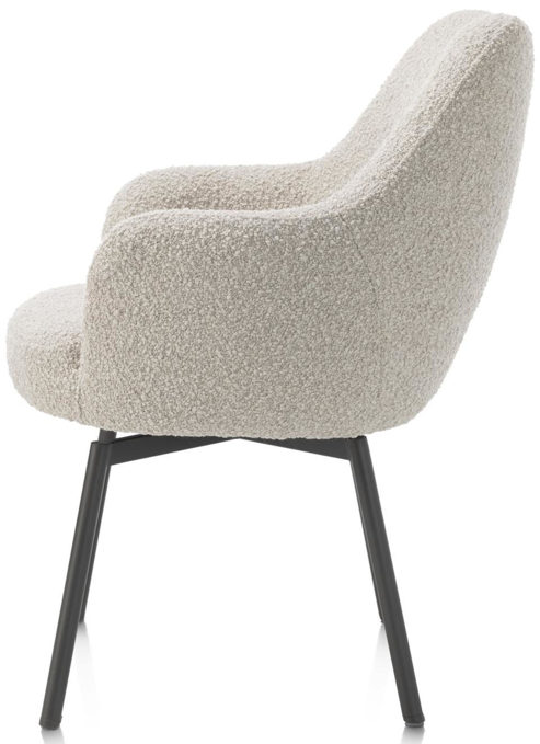 Der Stuhl Rocco von Henders & Hazel kombiniert modernes Design mit hohem Komfort. Ausgestattet mit einem Taschenfederkern und einem drehbaren Sitz bietet er optimalen Sitzkomfort. Der weiche Bouclé-Stoff ist in den eleganten Farben Creme sowie Leber erhältlich. Die breite Rückenlehne sorgt für zusätzlichen Halt, während die vier stabilen Metallbeine in Graphit dem Stuhl eine moderne Note verleihen. Alternativ sind auch Holzfüße verfügbar. Der Rocco ist zudem als Armlehnenstuhl erhältlich und eignet sich ideal für verschiedene Räume – vom Esszimmer bis zum Wohnzimmer.