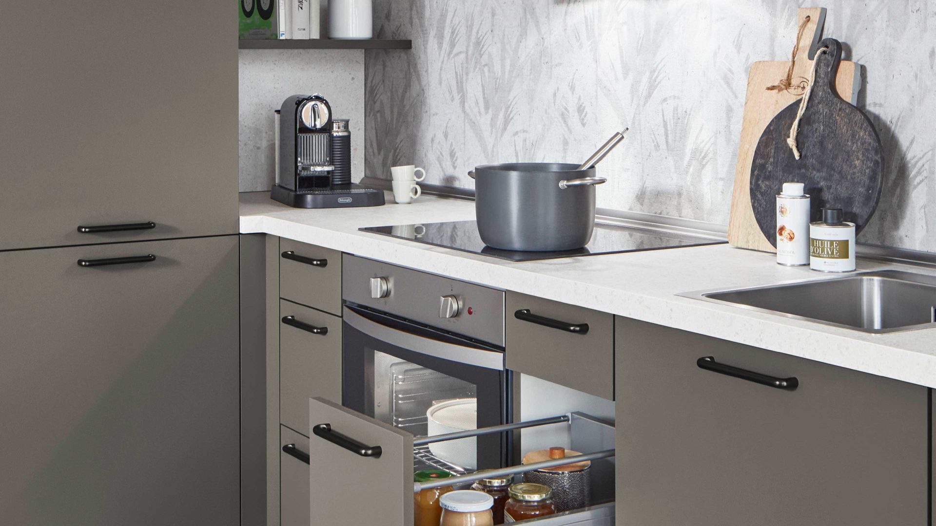 • Die Abbildung zeigt ein Wohnbeispiel, welches auch Dekoration sowie separat erhältliches Zubehör enthält. Im Lieferumfang enthalten ist eine dreiteilige Einbauküche mit Kühlschrank, einem Backofen und Kochfeld.