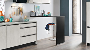Die dreizeilige EXPRESS KÜCHEN Einbauküche Base mit Einbaugeräten kombiniert matte steinweiße Beton-Nachbildung mit Arbeitsplatten, Sockelblenden und einem Ansetztisch in puristischem Schwarz. Schlichte, ebenfalls schwarze Griffleisten runden den modernen und eleganten Look der Planküche stilsicher ab.