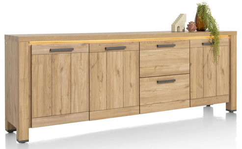 Das Sideboard Delmonte von Henders & Hazel kombiniert klassisches und rustikales Design mit modernen Akzenten. Es bietet mit seinen ansprechenden Paneelen und Metall-Details nicht nur einen ästhetischen Genuss, sondern auch viel Stauraum für den Wohnbereich. Hergestellt aus pflegeleichtem Primo Laminato in Eiche Natur, bietet es das Aussehen von echtem Holz, ist aber deutlich widerstandsfähiger gegen Kratzer. Das Sideboard ist in Breiten von 190 cm und 230 cm erhältlich und variiert in der Anzahl der Türen und Schubladen. Ein besonderes Highlight ist die integrierte LED-Stimmungsbeleuchtung mit Touch-Einbaudimmer, die eine angenehme Atmosphäre schafft. Zudem sorgt das Soft-Close-System für ein leises und sanftes Schließen der Türen, was den Nutzungskomfort erhöht.