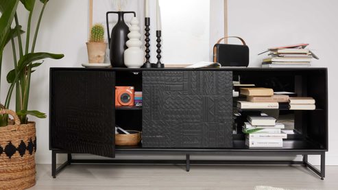 gebürstetes schwarz gebeiztes und lackiertes Mangoholz, kombiniert mit schwarz lackiertem MDF, Klarglas und schwarzem Metall