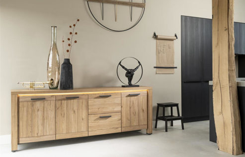 Das Sideboard Delmonte von Henders & Hazel kombiniert klassisches und rustikales Design mit modernen Akzenten. Es bietet mit seinen ansprechenden Paneelen und Metall-Details nicht nur einen ästhetischen Genuss, sondern auch viel Stauraum für den Wohnbereich. Hergestellt aus pflegeleichtem Primo Laminato in Eiche Natur, bietet es das Aussehen von echtem Holz, ist aber deutlich widerstandsfähiger gegen Kratzer. Das Sideboard ist in Breiten von 190 cm und 230 cm erhältlich und variiert in der Anzahl der Türen und Schubladen. Ein besonderes Highlight ist die integrierte LED-Stimmungsbeleuchtung mit Touch-Einbaudimmer, die eine angenehme Atmosphäre schafft. Zudem sorgt das Soft-Close-System für ein leises und sanftes Schließen der Türen, was den Nutzungskomfort erhöht.
