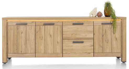 Das Sideboard Delmonte von Henders & Hazel kombiniert klassisches und rustikales Design mit modernen Akzenten. Es bietet mit seinen ansprechenden Paneelen und Metall-Details nicht nur einen ästhetischen Genuss, sondern auch viel Stauraum für den Wohnbereich. Hergestellt aus pflegeleichtem Primo Laminato in Eiche Natur, bietet es das Aussehen von echtem Holz, ist aber deutlich widerstandsfähiger gegen Kratzer. Das Sideboard ist in Breiten von 190 cm und 230 cm erhältlich und variiert in der Anzahl der Türen und Schubladen. Ein besonderes Highlight ist die integrierte LED-Stimmungsbeleuchtung mit Touch-Einbaudimmer, die eine angenehme Atmosphäre schafft. Zudem sorgt das Soft-Close-System für ein leises und sanftes Schließen der Türen, was den Nutzungskomfort erhöht.