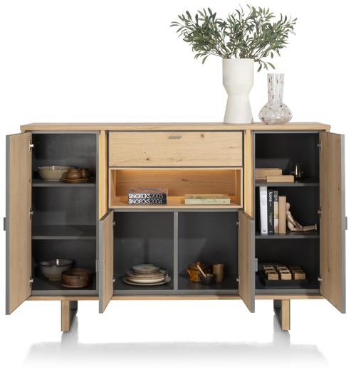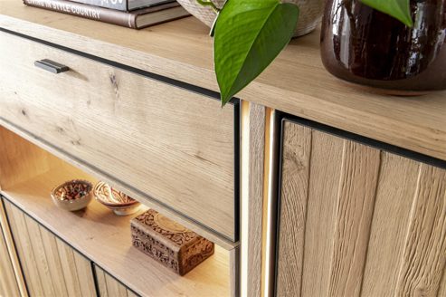 Ein besonderer Blickfang ist das Metallprofil, das Türen und Schubladen umrahmt. In edlem Anthrazit gehalten, bildet es einen stilvollen Kontrast zum warmen Ton des Eichenholzes und fügt dem Design eine zeitgenössische Note hinzu. Dieses Detail betont die klare Linienführung des Highboards und unterstreicht seine moderne Eleganz.