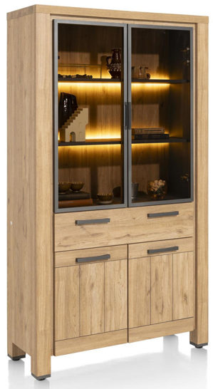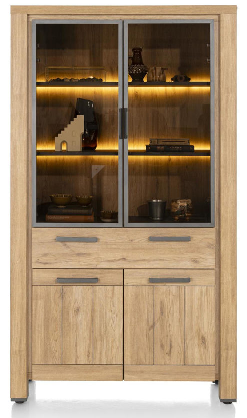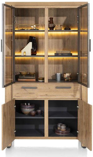 Obwohl sie wie eine hochwertige Massivholzvitrine aussieht, besteht die Delmonte aus leichtem, kratzfestem und pflegeleichtem Primo Laminato (HPL) – perfekt für den Alltag. Die obere Hälfte bietet zwei Glastüren für die ansprechende Präsentation von Objekten, während die LED-Beleuchtung Ihre Lieblingsstücke hervorhebt. Unten sorgen zwei Schranktüren und eine praktische Schublade für ausreichend Stauraum und Ordnung.