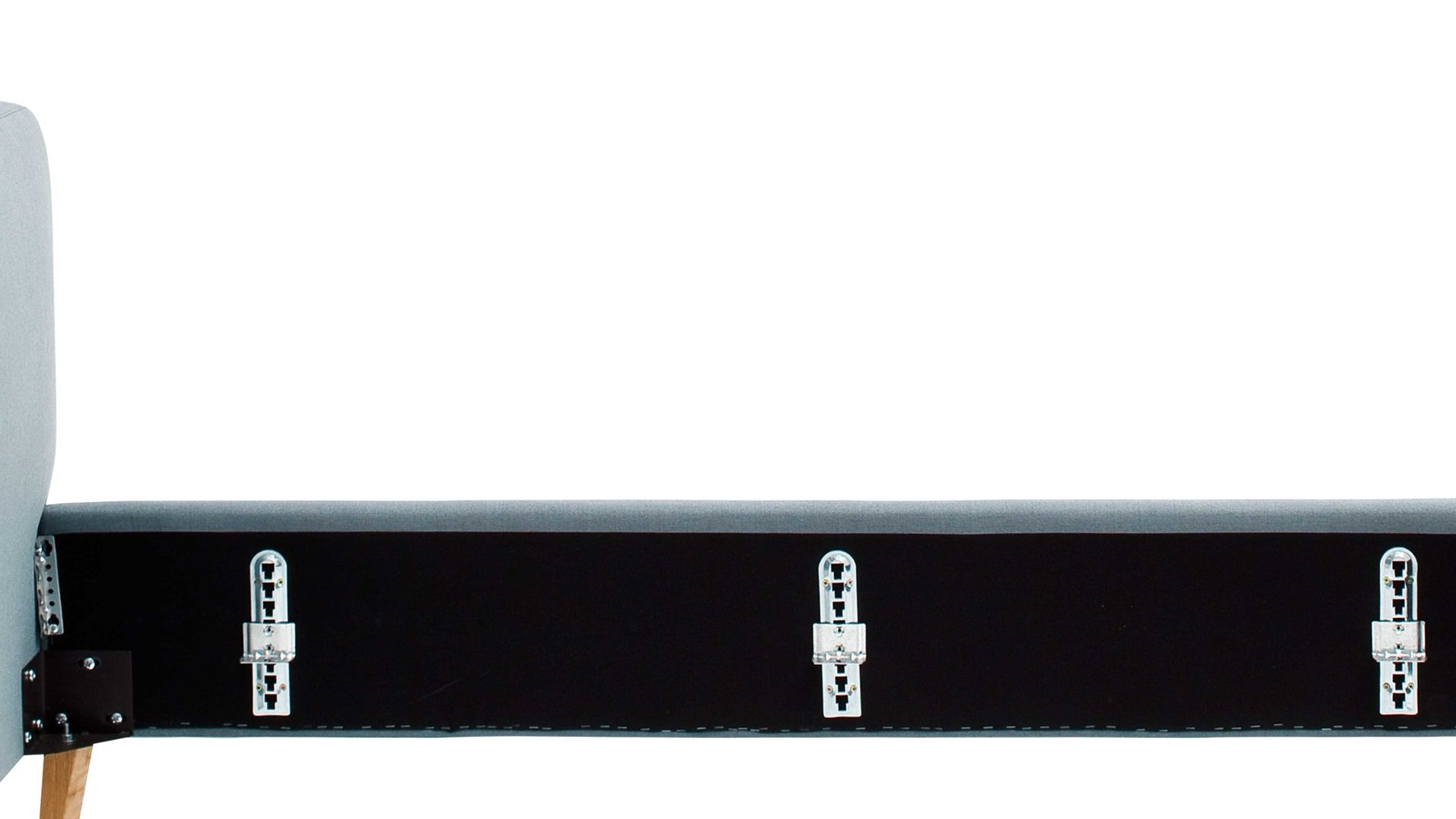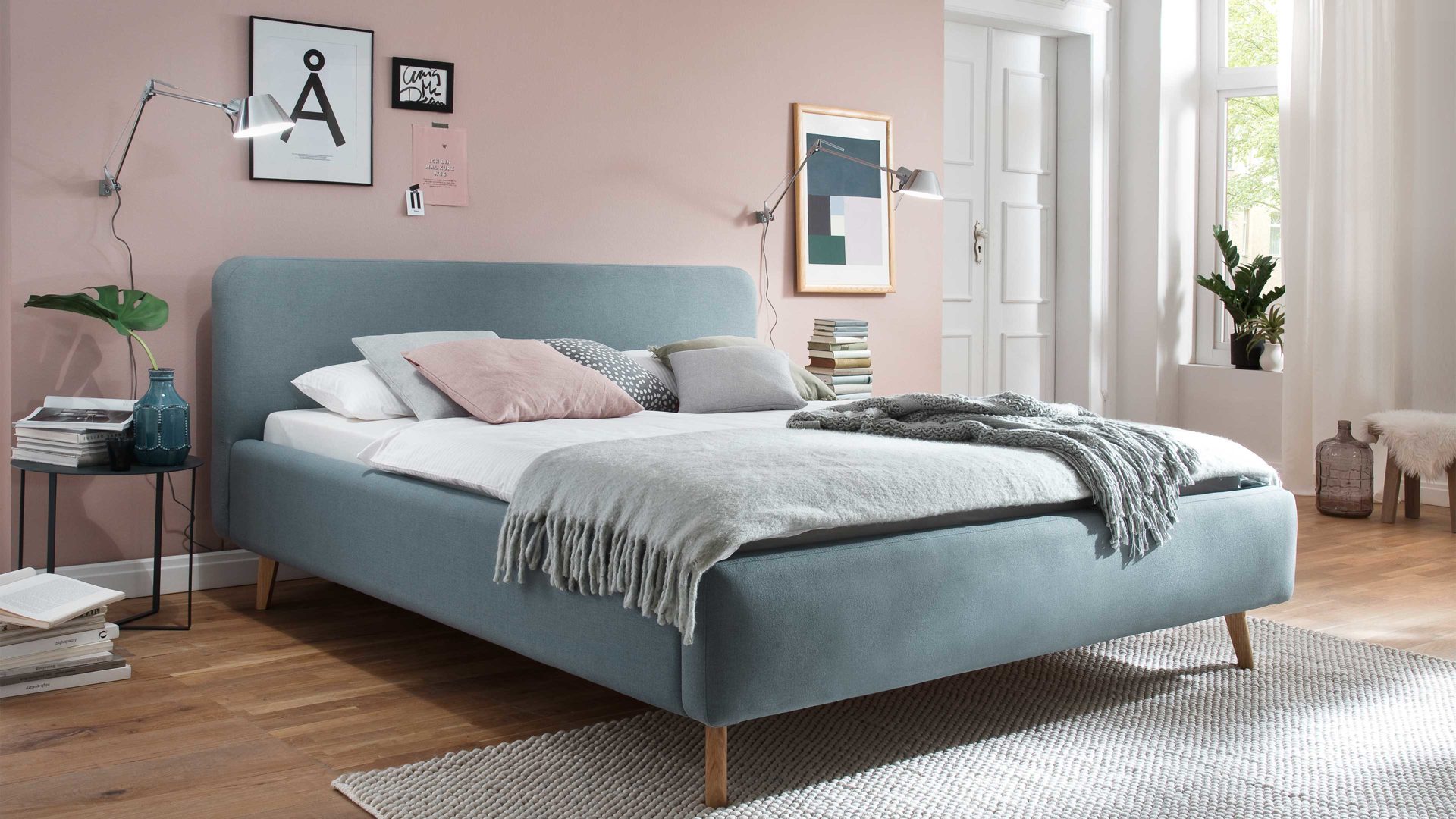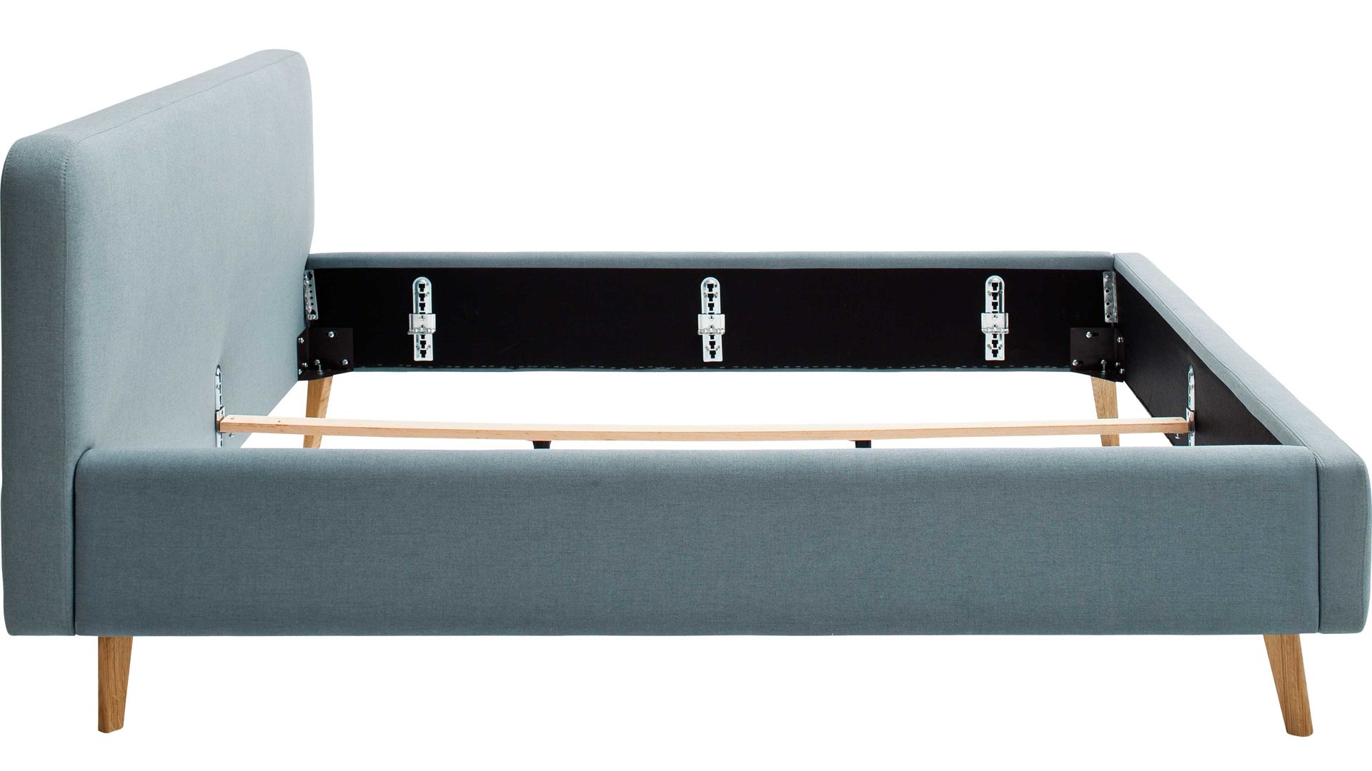 Mit den eichefarbenen Holzfüßen und dem eisblauen Flachgewebebezug bringt das Polsterbettgestell Mattis maritimes Flair in Ihr Schlafzimmer.