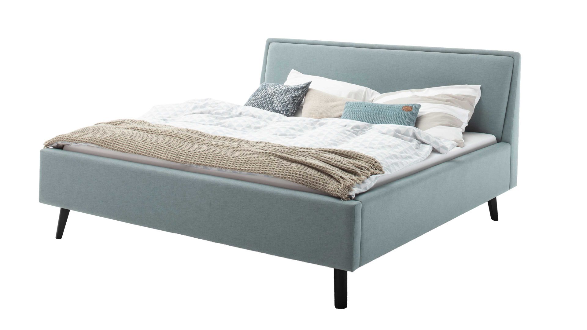 Die warme Farbe der Füße kontrastiert mit dem frischen Ton des Bezugs - und doch harmonieren die beiden Nuancen hervorragend und verführen zu Traumreisen - beziehungsweise Reiseträumen - ans Meer und einen herrlich warmen Sandstrand. Ein weiteres Highlight des rundum überzeugenden Bettgestells bildet das glatt bezogene Polsterkopfteil. Dieses ermöglicht durch die weiche Haptik auch entspannt angelehntes Sitzen, etwa abends beim Lesen vor dem Schlafen oder morgens beim Blick aus dem Fenster zum Wachwerden.