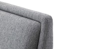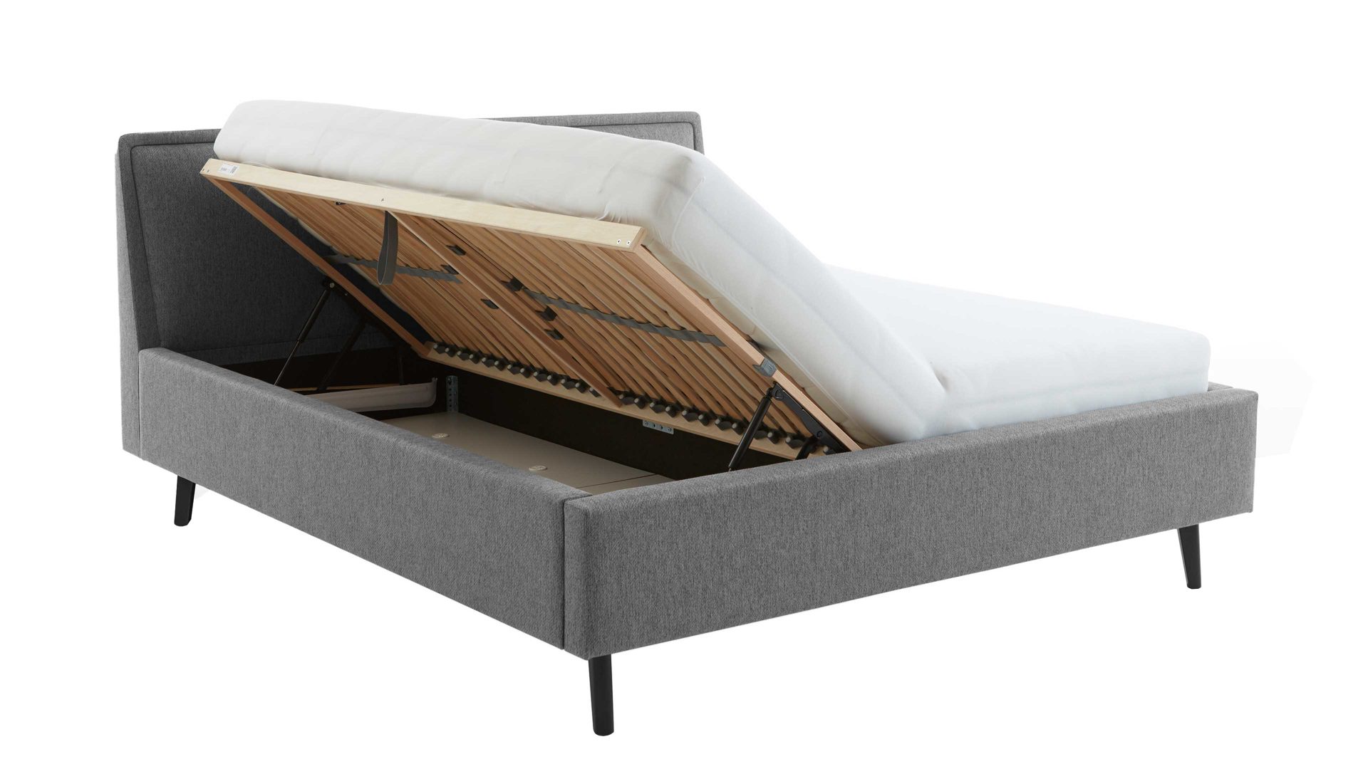Das Polsterbettgestell Frieda mit Bettkasten verkörpert modernen Komfort. Mit dem grauen Stoffbezug und den schwarzen Holzfüßen präsentiert es sich elegant und gemütlich designt. Die Bettseiten sind genauso wie das Polsterkopfteil glatt bezogen. Letzteres ist eine angenehm weiche Rückenlehne, wenn Sie abends im Bett vor dem Schlafen noch entspannt in Ihrem Buch lesen oder fernsehen möchten.