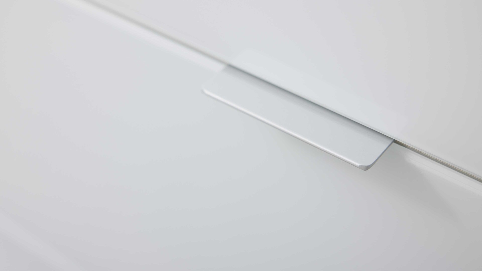 Mit ihren puristisch alpinweißen Glasfronten und dem eleganten Oberboden in Artisan-Eiche-Nachbildung bringt die Schubladenkommode aus der Interliving Kleiderschrank Serie 1208 moderne Extravaganz in dein Schlafzimmer. Matt aluminiumfarbene Griffe und eine edle Texline-Innenausstattung runden das harmonische Design perfekt ab.