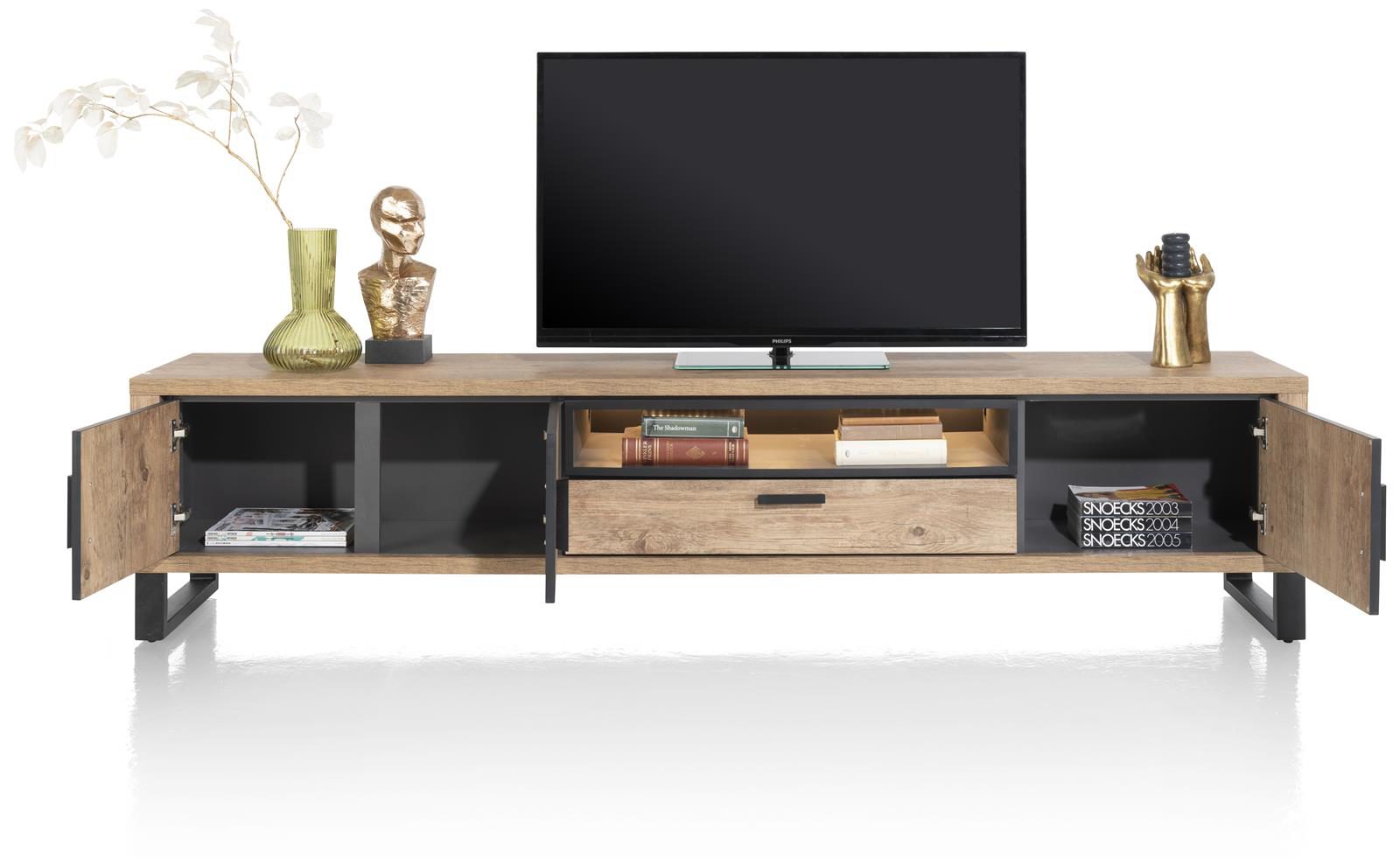 Mit seinen drei Türen, einer Schublade und einer Nische bietet das Lowboard ausreichend Stauraum für verschiedenste Gegenstände, sei es elektronische Geräte, Bücher oder Dekorationsartikel. Die LED-Beleuchtung in der Nische verleiht dem Raum eine angenehme Atmosphäre und setzt Ihre Lieblingsstücke gekonnt in Szene.