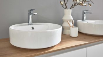 Das Set beinhaltet zwei Waschtischschränke (Typ 67447), die jeweils mit einer Innenblende, einem großzügigen Auszug und einer Holzrückwand ausgestattet sind. Maße pro Schrank: ca. 80 x 43 x 46 cm (B/LxHxT). Die Auszüge sind mit komforttablem Soft-Close und Selbsteinzug ausgestattet. Gegen Mehrpreis kannst du Glas-Seitenwände erhalten. Ergänzt werden sie durch zwei runde, weiße Keramik-Aufbauwaschtische (Typ 87732) mit Hahnlochbohrung und Überlauf. Maße: Durchmesser ca. 45 cm, Höhe ca. 15 cm.