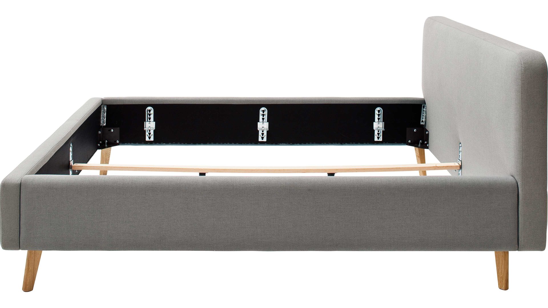Mit den eichefarbenen Holzfüßen und dem hellgrauen Flachgewebebezug bringt das Polsterbettgestell Mattis modernes Flair in Ihr Schlafzimmer.